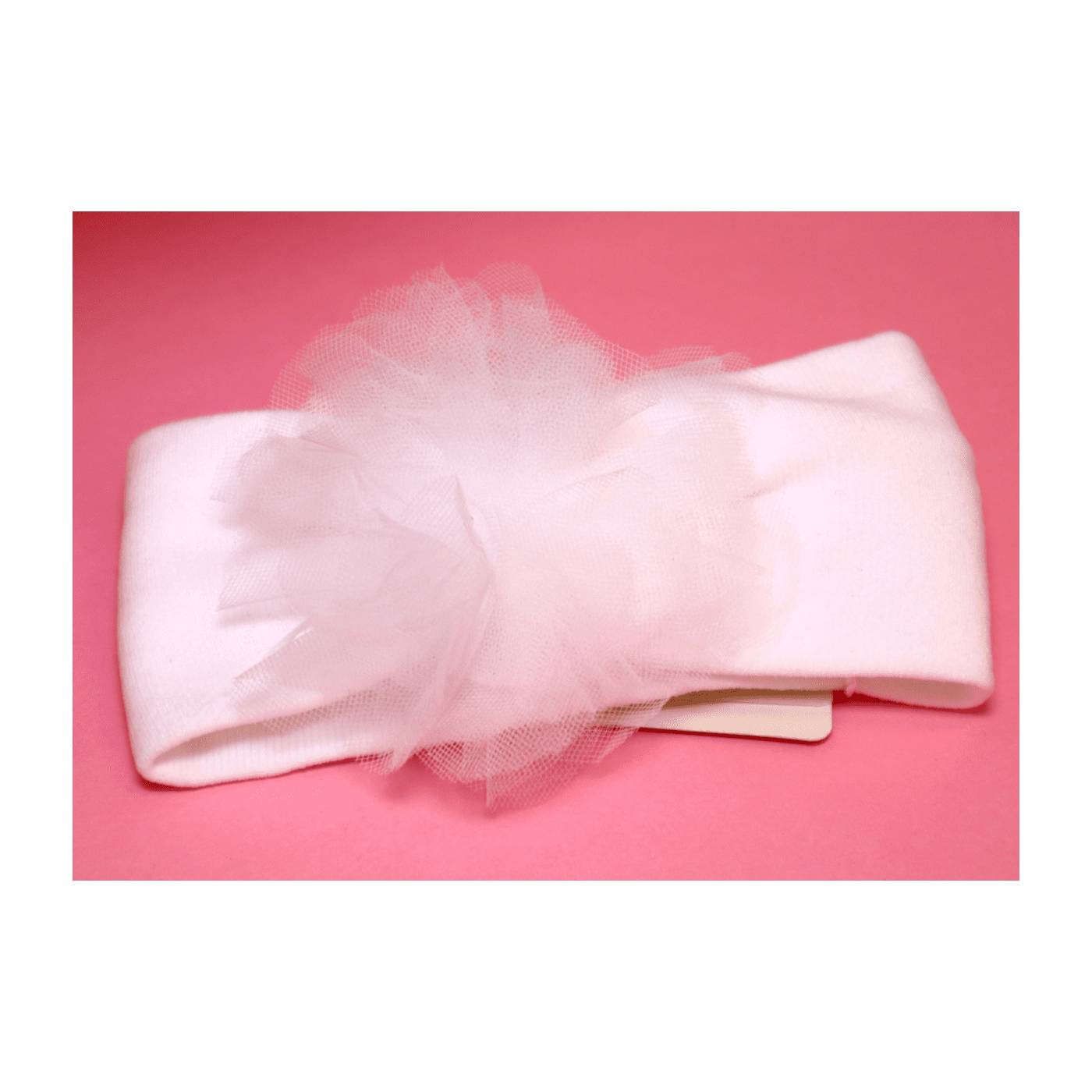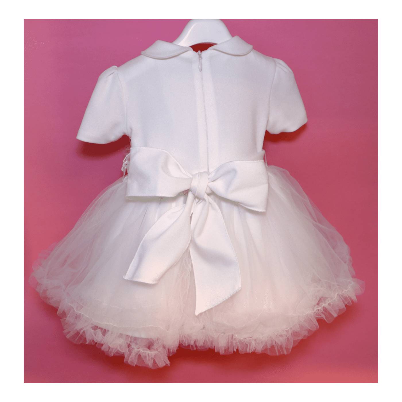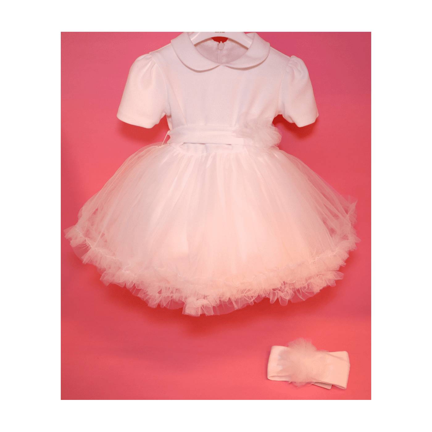Abito da Battesimo bianco con corpetto semplice a mezza manica, adatto alla stagione primaverile e autunnale se accompagnato da un coprispalle, in inverno l'alternativa è mettere sotto un lupetto tono su tono. In vita vi è un cintino con un fiore laterale che riprende il tulle della gonna, lo stesso fiore lo ritroviamo nella fascetta per i capelli, il cintino va annodato sul retro formando un fiocco. La particolarita' del capo sta nella gonna, un multistrato di tulle rendono il vestitino modello bambolina creandone volume.