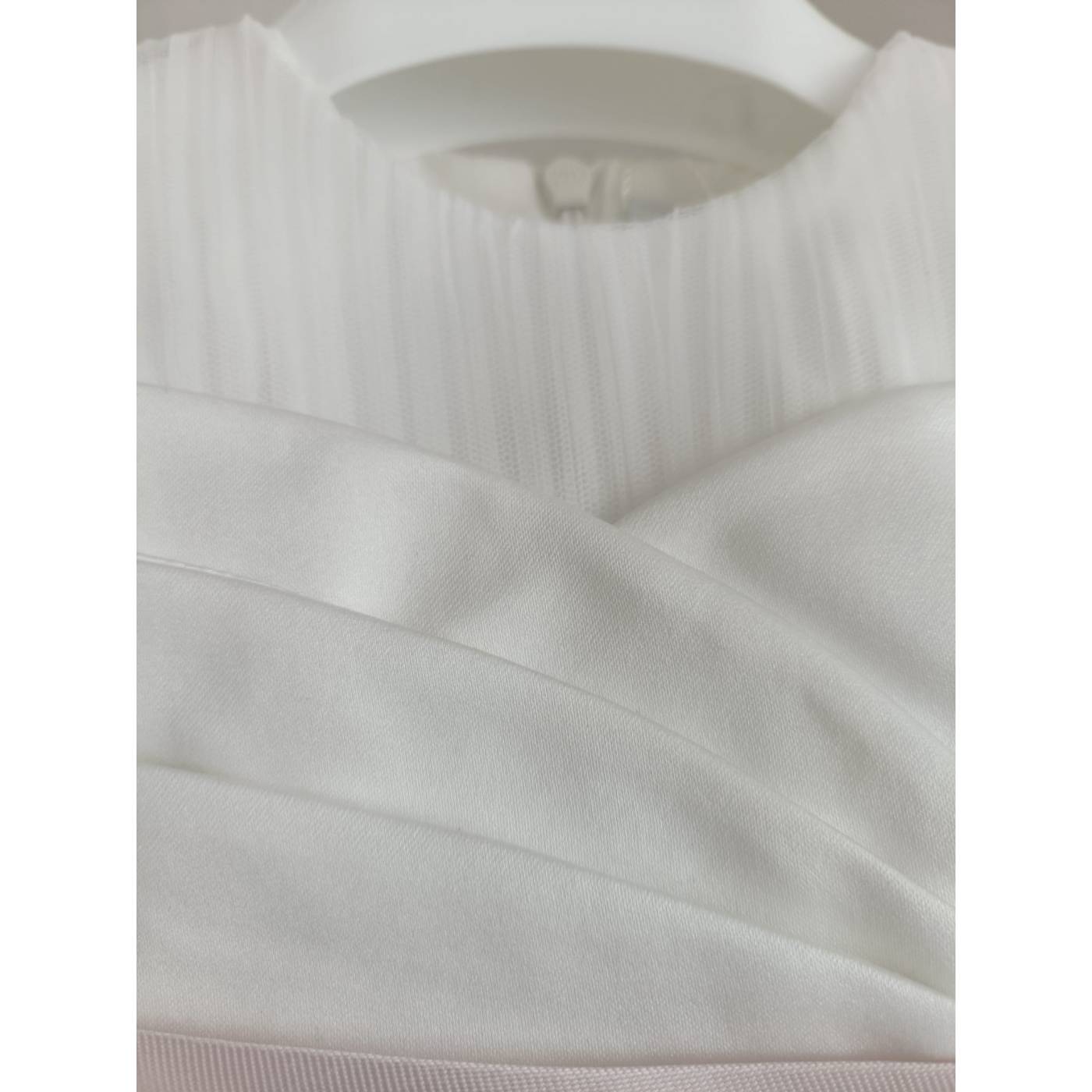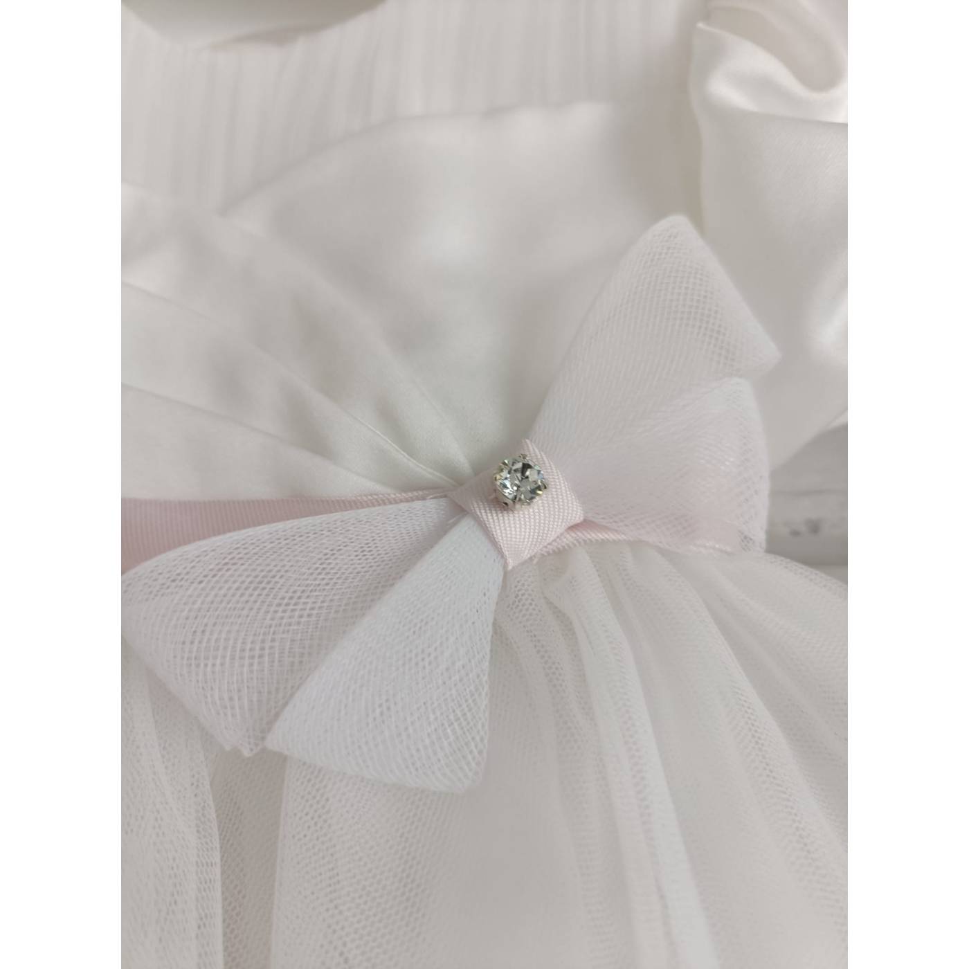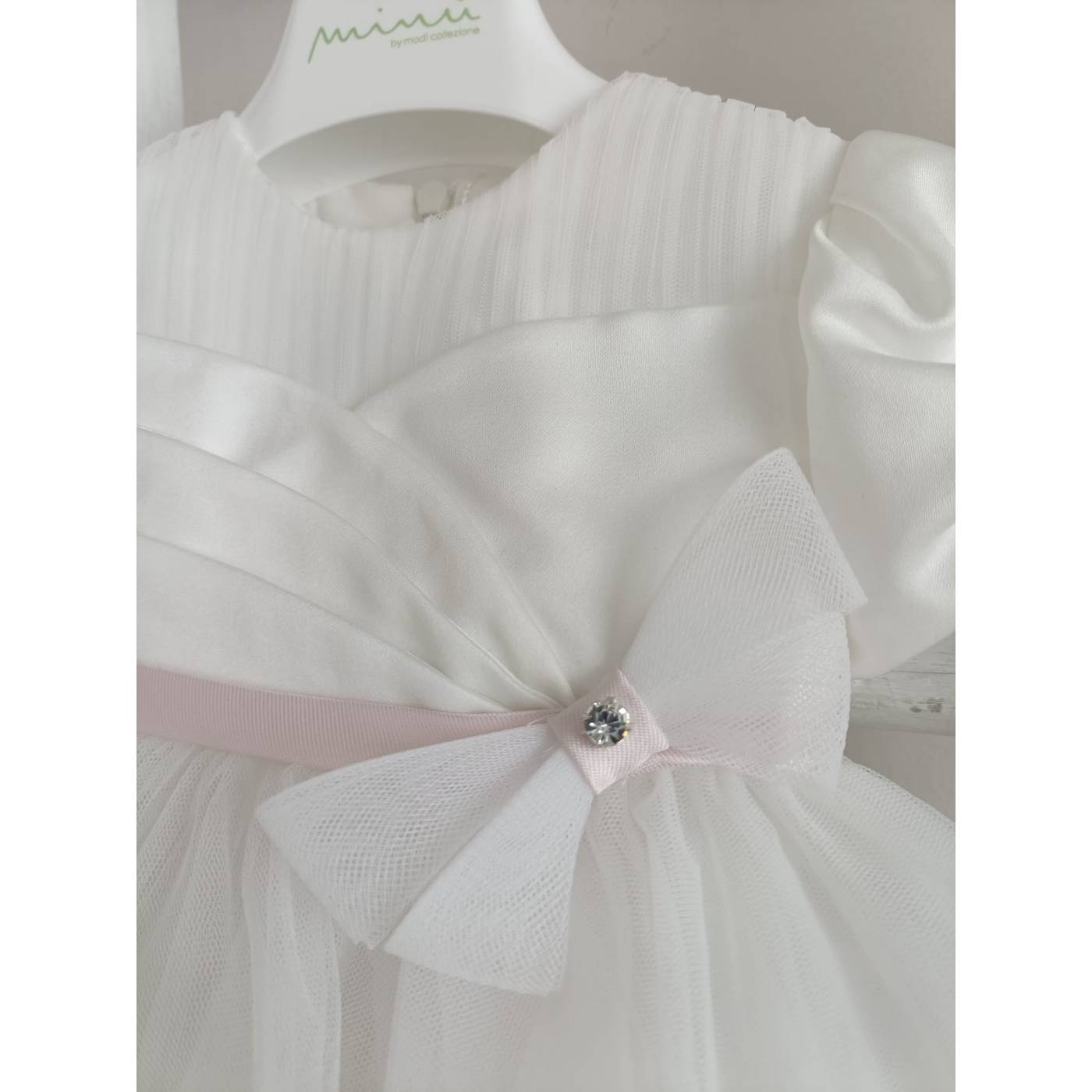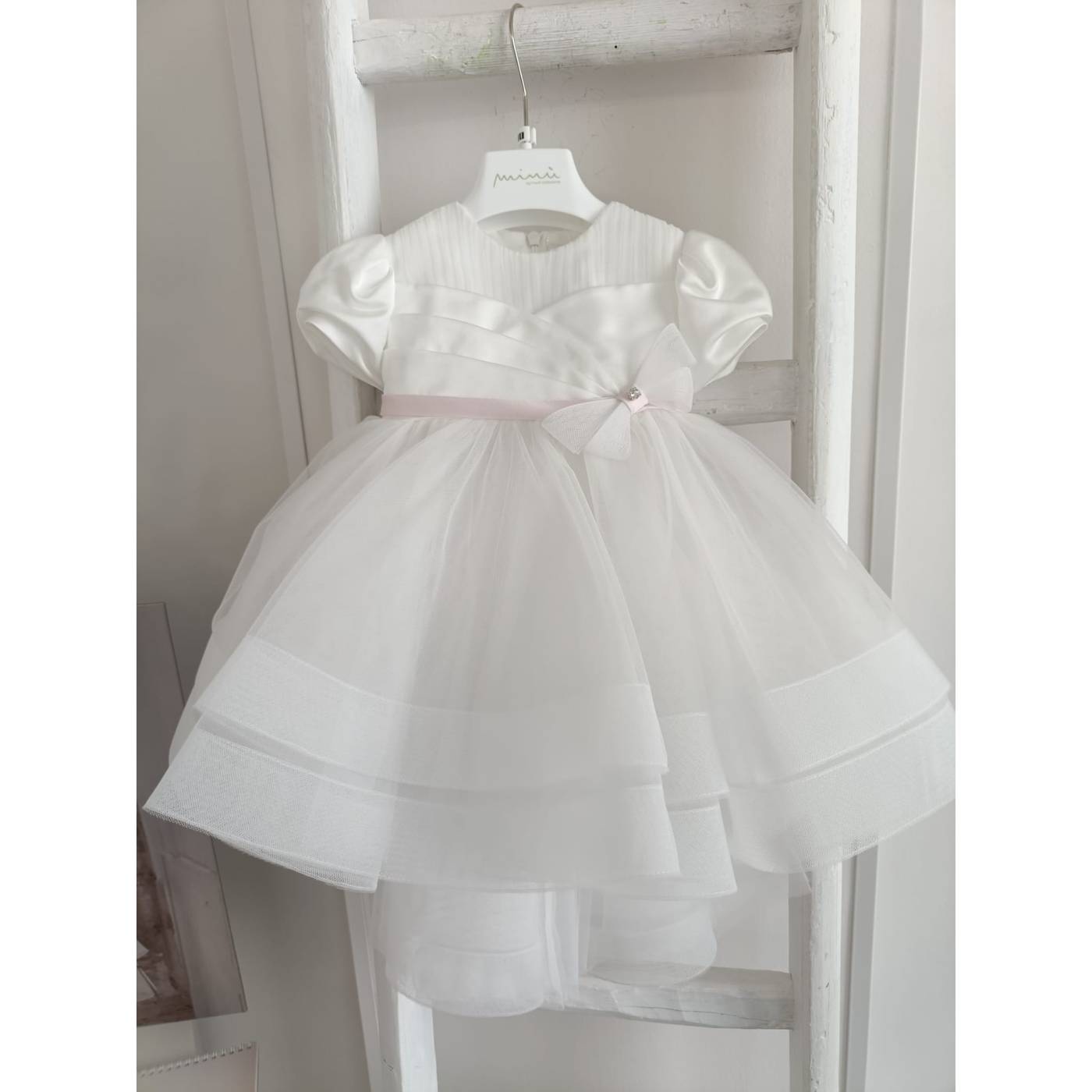 Un design romantico accompagna questo meraviglioso capo. Il corpetto è a forma di cuore, sopra invece un tessuto plissettato, mezza manichetta; in vita un cintino di color rosa delicato con fiocco laterale accompagnato da uno strass che dona ancora più lucentezza al capo, proseguono tanti strati in tulle che donano movimento e sontuosità alla parte inferiore del vestito.