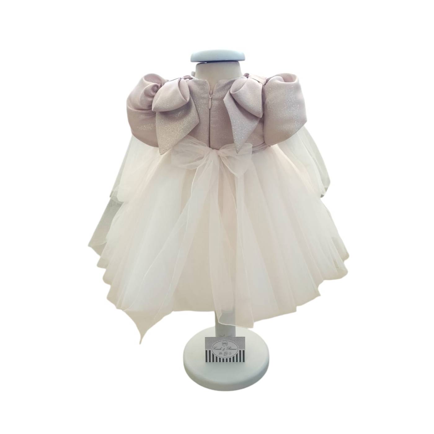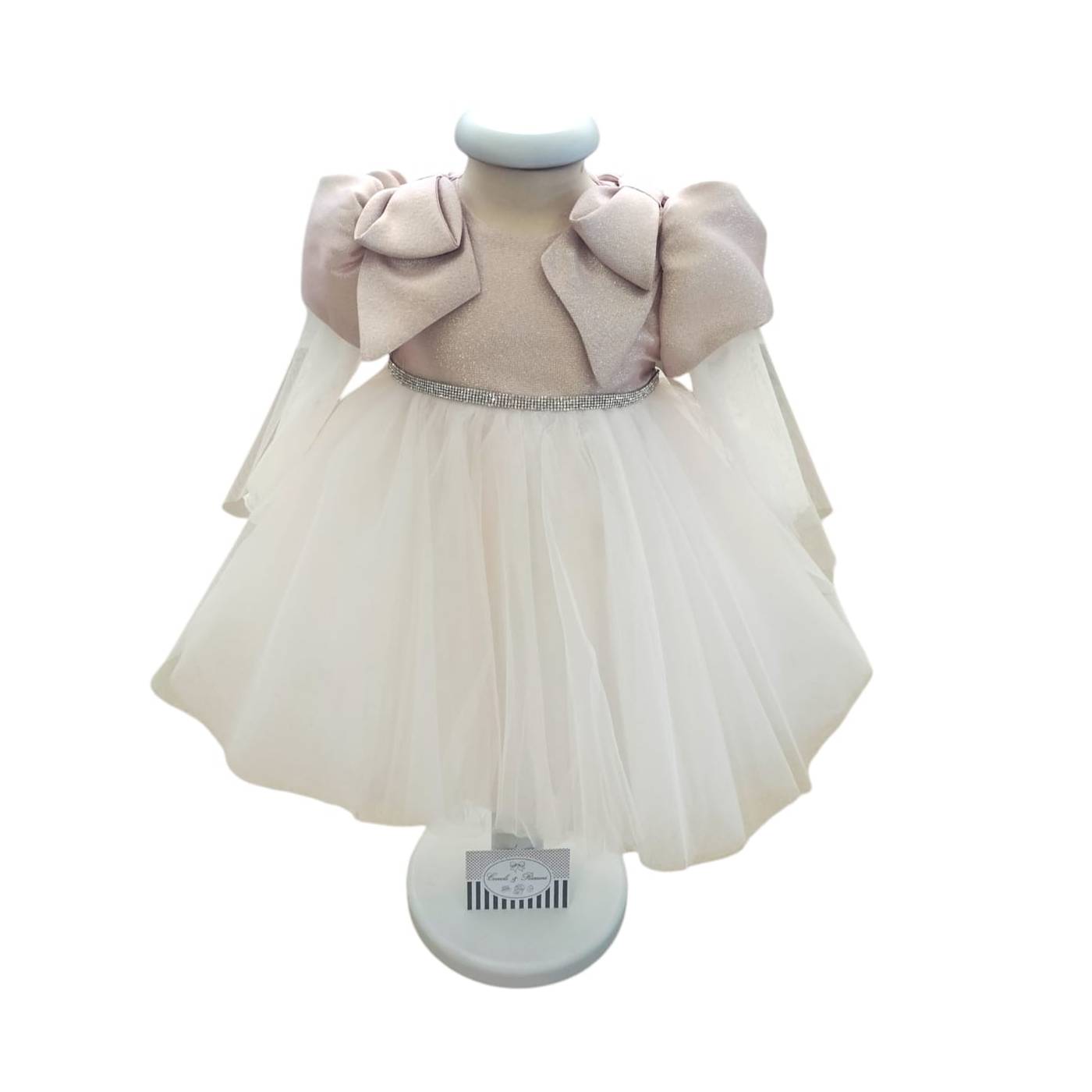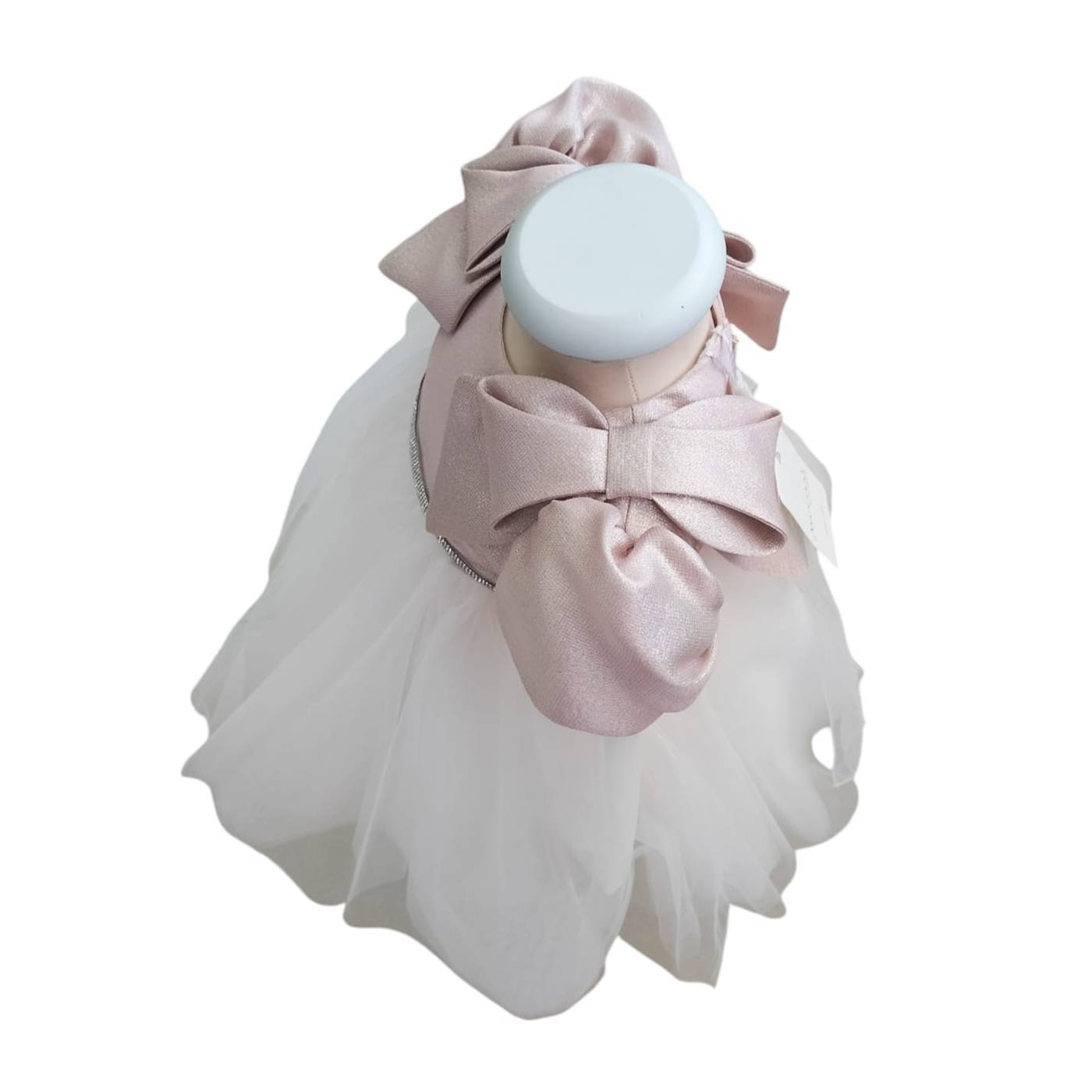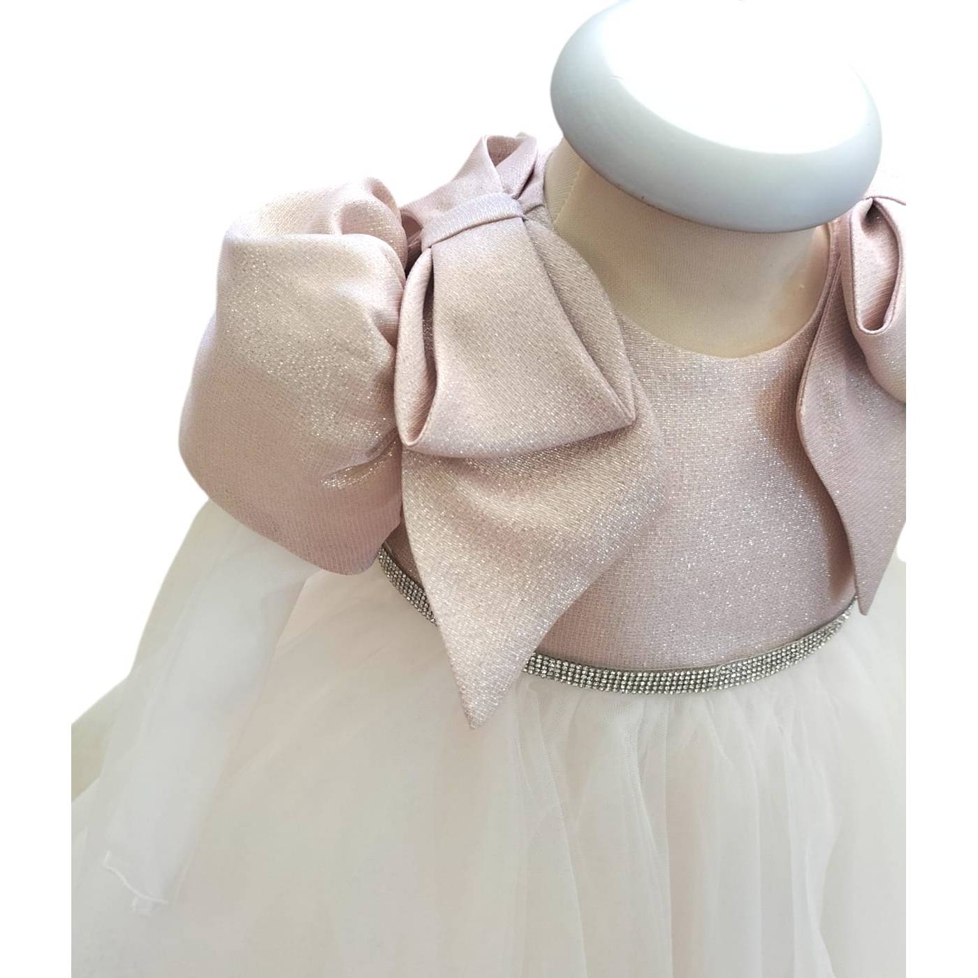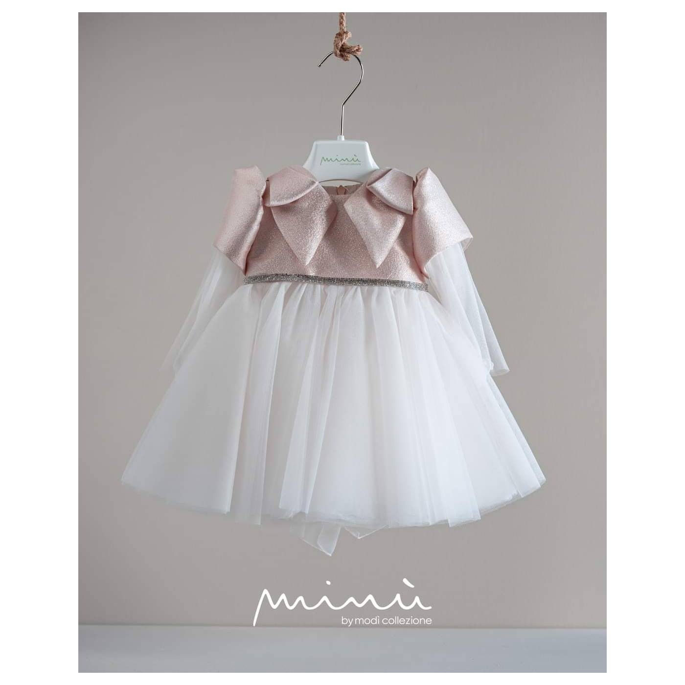 Raffinato questo abito da battesimo/cerimonia del brand Minù. Corpetto in tessuto effetto lurex rosa presenta dei meravigliosi fiocchi sulle spalle che scendono verso il corpetto; manichetta corta a palloncino da cui proseguono strati di tulle che creano un effetto vedo non vedo sulle braccia donando eleganza al capo; finto cintino di brillantini in vita, prosegue poi una gonna in multistrati di tulle con sfumature del rosa creando un effetto bambolina.