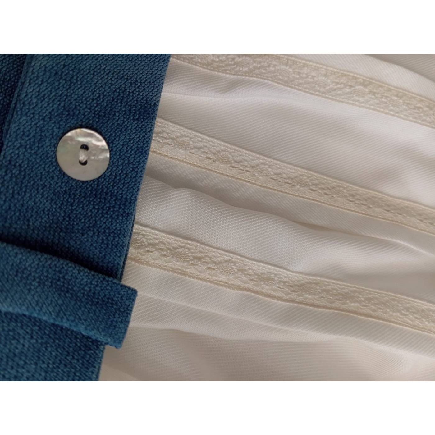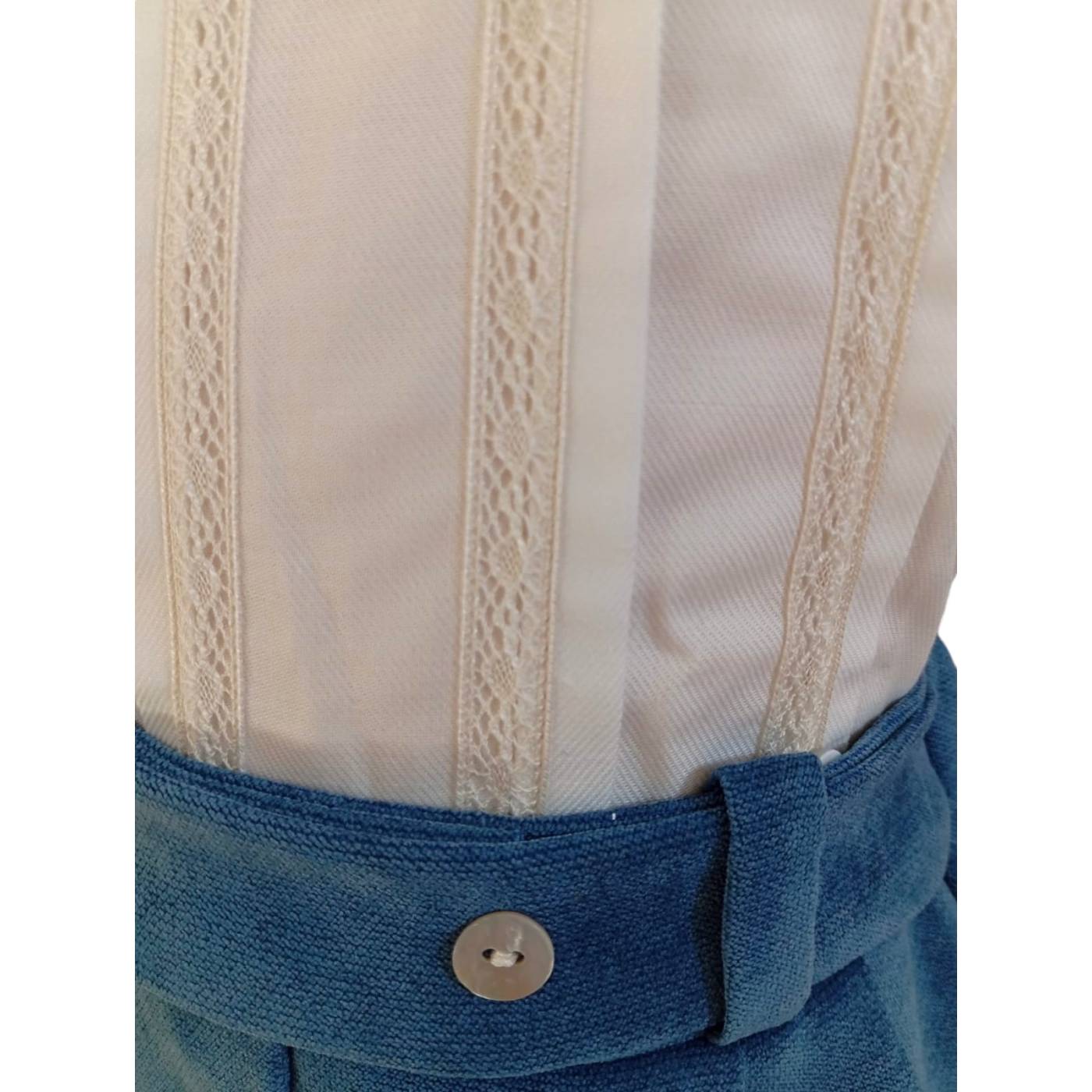 Fondo bianco latte, la particolarità sta nella camicia, manica lunga, colletto alla coreana presenta dei piccoli tramezzi in cotone color beige.