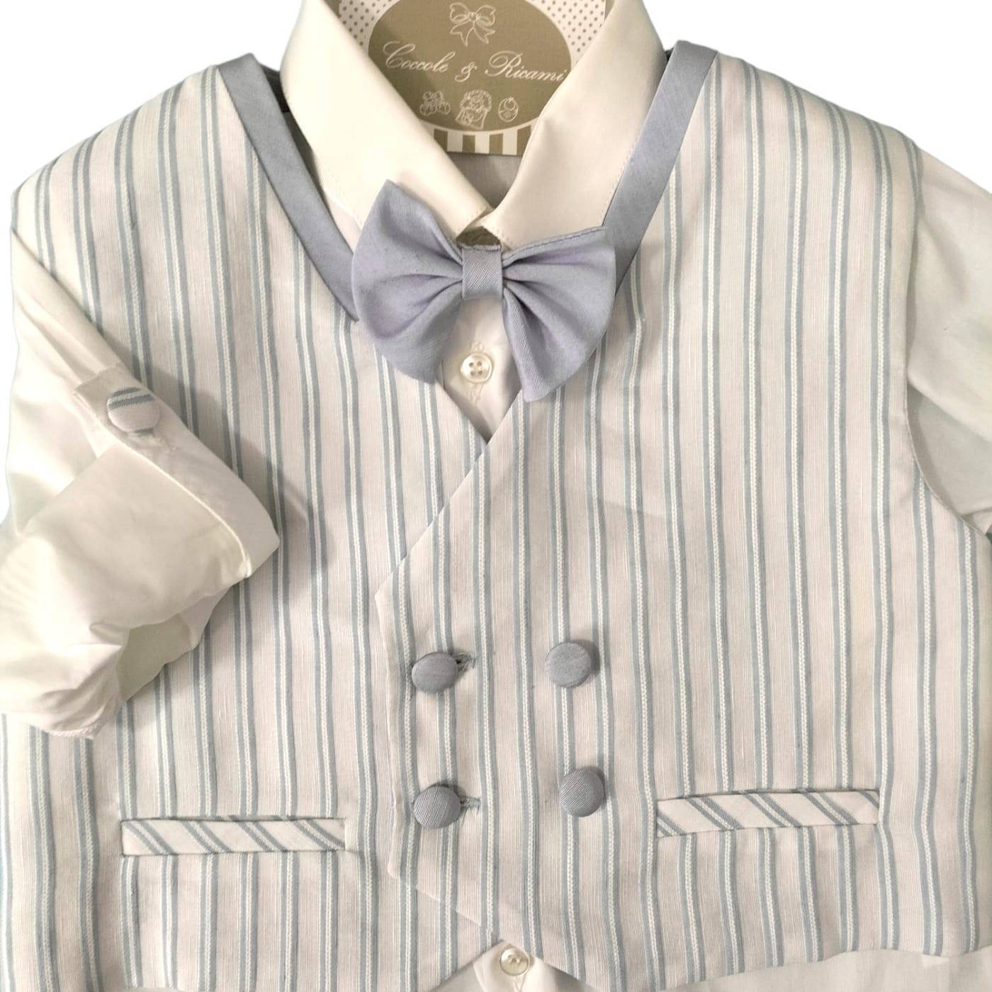 Completo 4 pezzi bambino in tessuto leggero ideale per i Battesimi e le cerimonie estive. Composto da gilet a righe bianche e celesti, sul retro invece solo fondo celeste,; papillon celeste che riprendono i bottoni; camicina in puro cotone con possibilità di svoltare le maniche e fermarle col bottone; pantalone celeste.