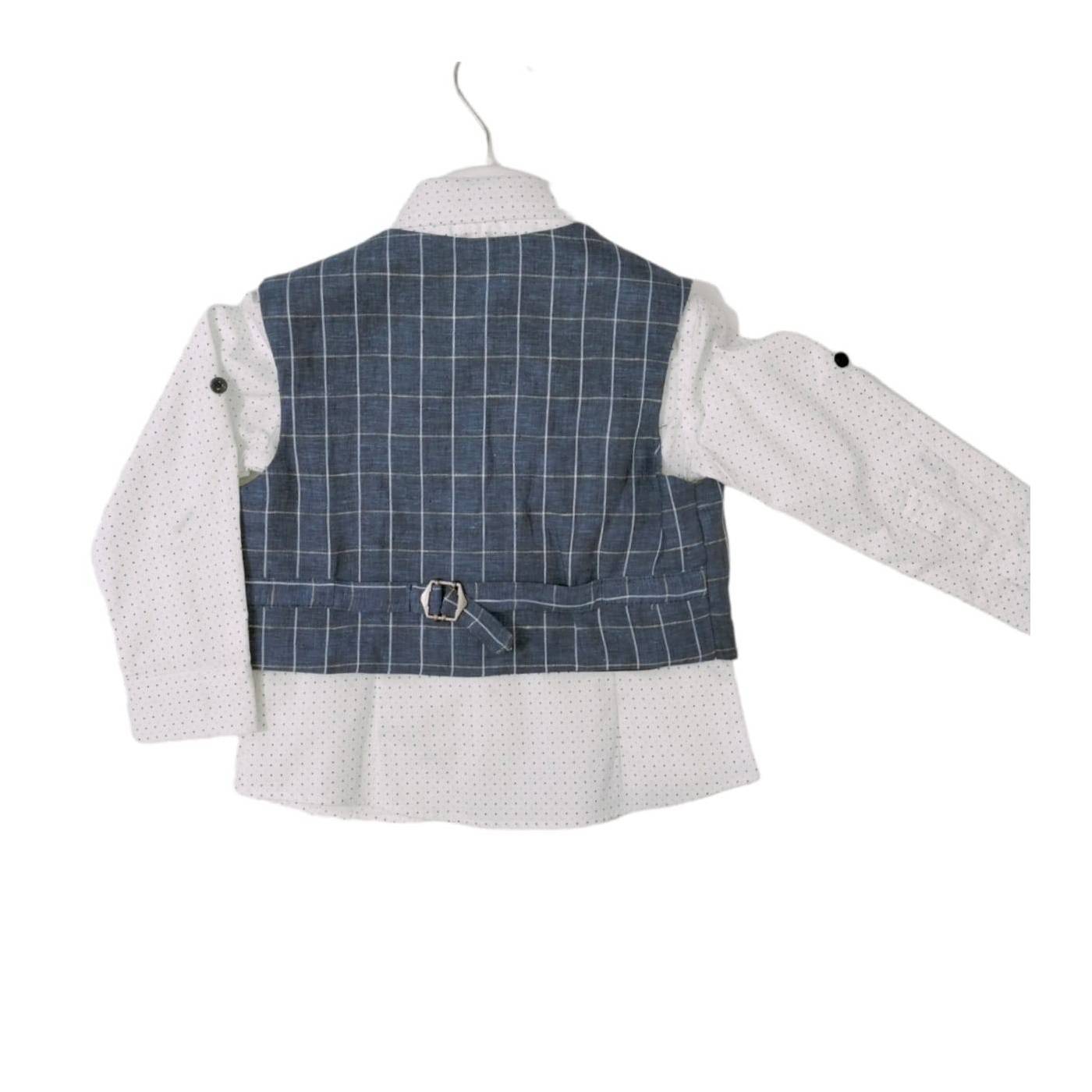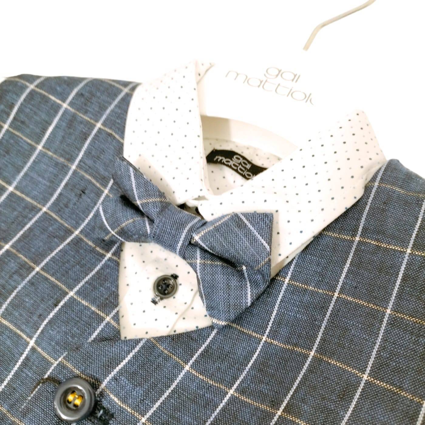 Elegante competo in cotone per bambino misura 24 mesi Gai Mattiolo. composto da 4 pezzi: papillon; gilet a quadretti in misto lino; camicia in cotone fondo bianco con piccolissimi pois in contrasto,  possibilità di svoltare le maniche grazie al bottone in alto alla manichetta; pantalone lungo composto dal 93%  cotone e 3% elastomero. Adatto alle cerimonie primaverili, estive o di inizio autunno.
