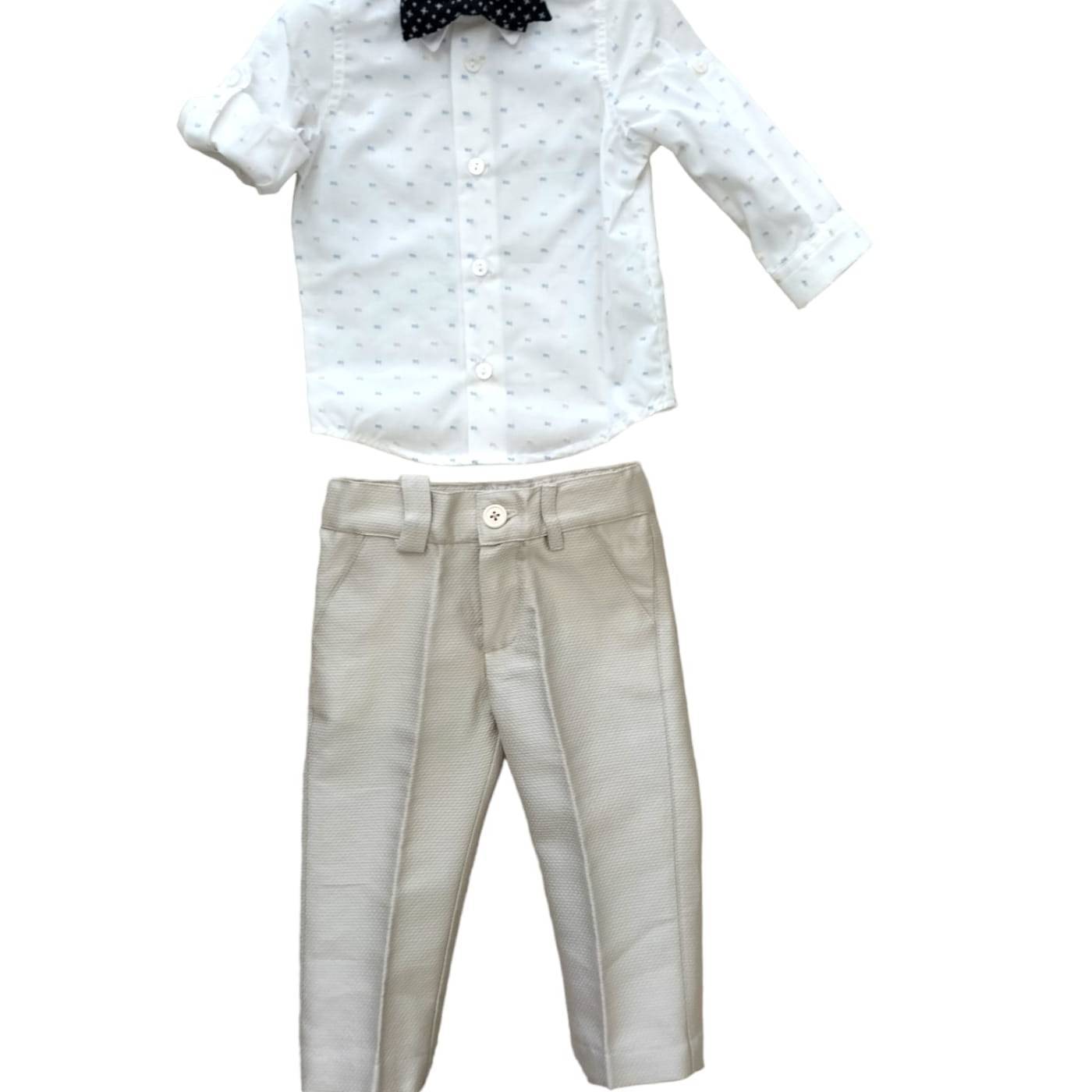 Completo elegante bambino adatto al Battesimo o una cerimonia nel periodo primaverile ed autunnale. Composto da giacca e pantaloni effetto semilucidi, camicina in cotone e papillon.