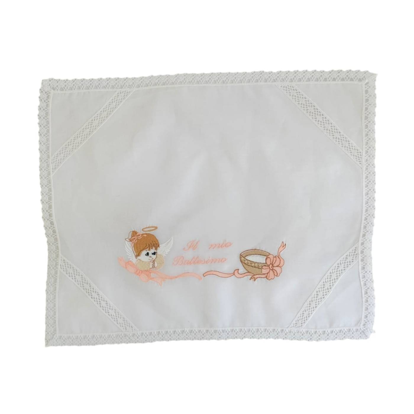 Lenço de batismo em algodão macio sobre fundo branco redefinido com um pequeno laço de algodão tom sobre tom, anjo bordado e pia batismal com a inscrição "O meu batismo".