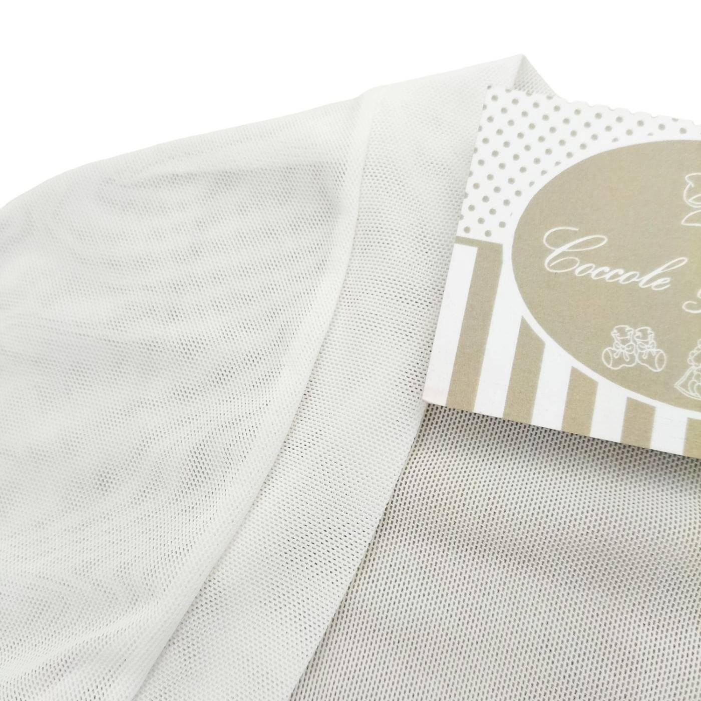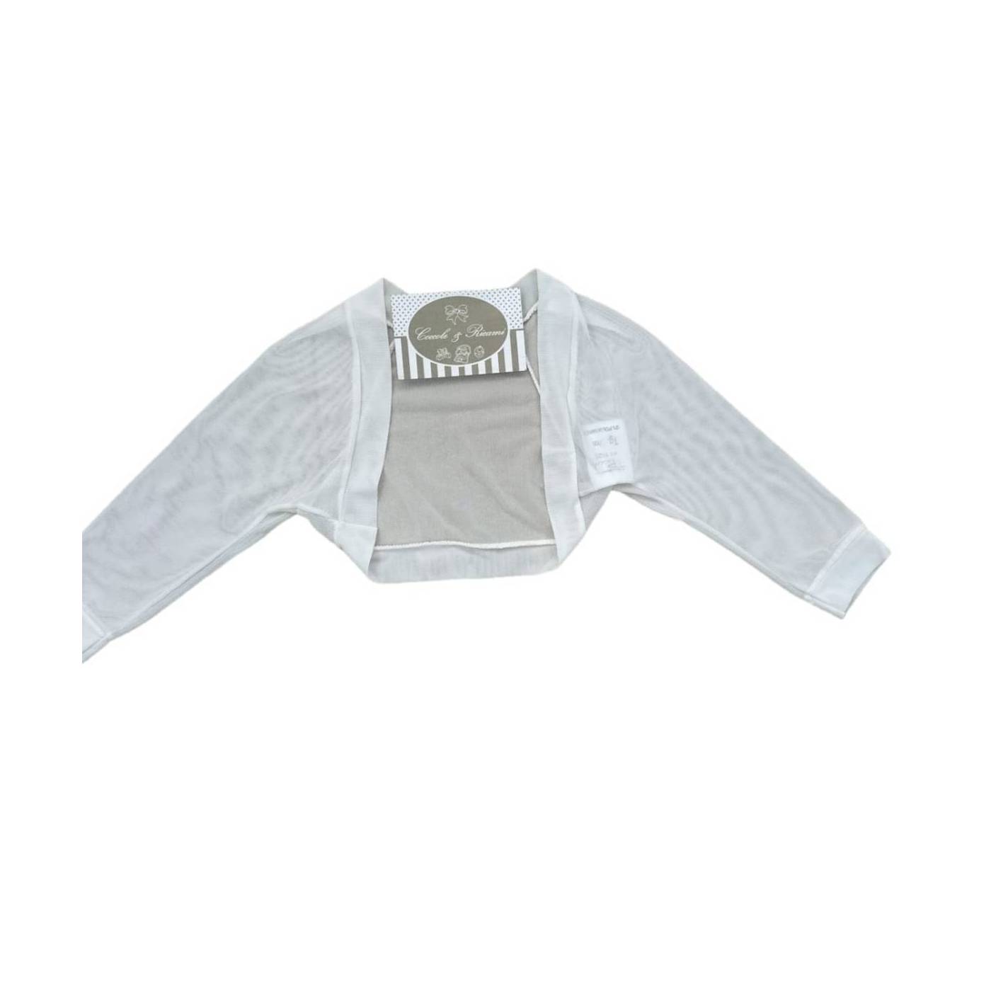 Elegante xaile em tule, adequado para acompanhar e complementar com elegância os vestidos de batizado sem mangas ou de mangas curtas. Esta peça torna o conjunto mais elegante, pois cria um efeito transparente ao longo dos braços e dos ombros da menina, que será docemente acariciada por este tecido muito suave ao toque.