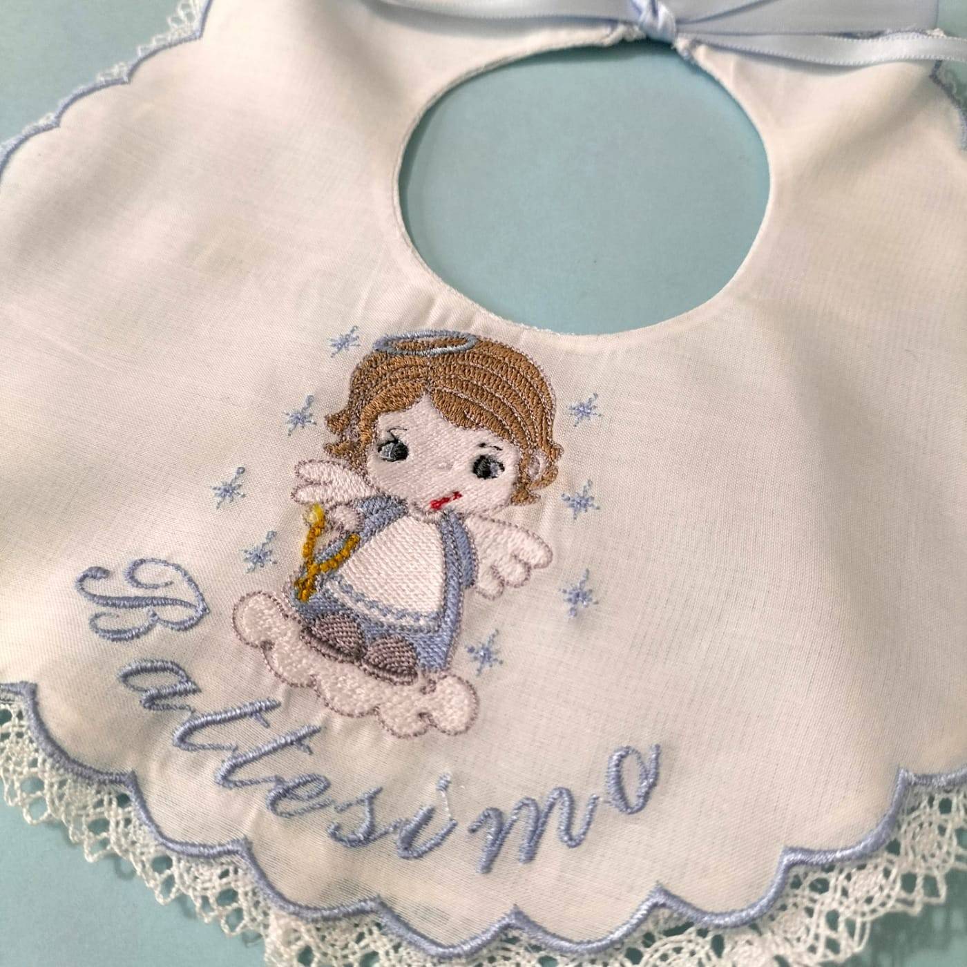 Babete de fundo branco com anjo bordado, esmeril e inscrição de batismo azul claro, tudo acompanhado por um laço de algodão branco.