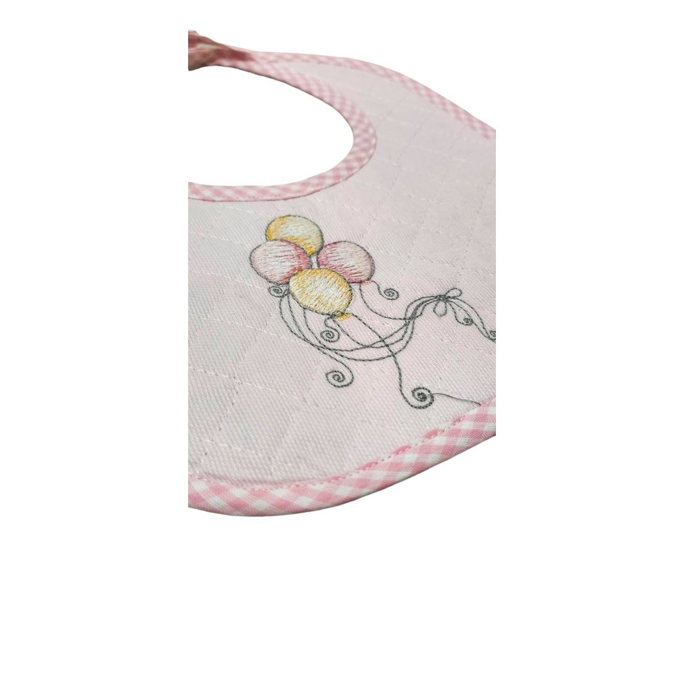 Fofo babete em algodão rosa macio acolchoado com balões bordados à máquina, redefinido com viés e laço.