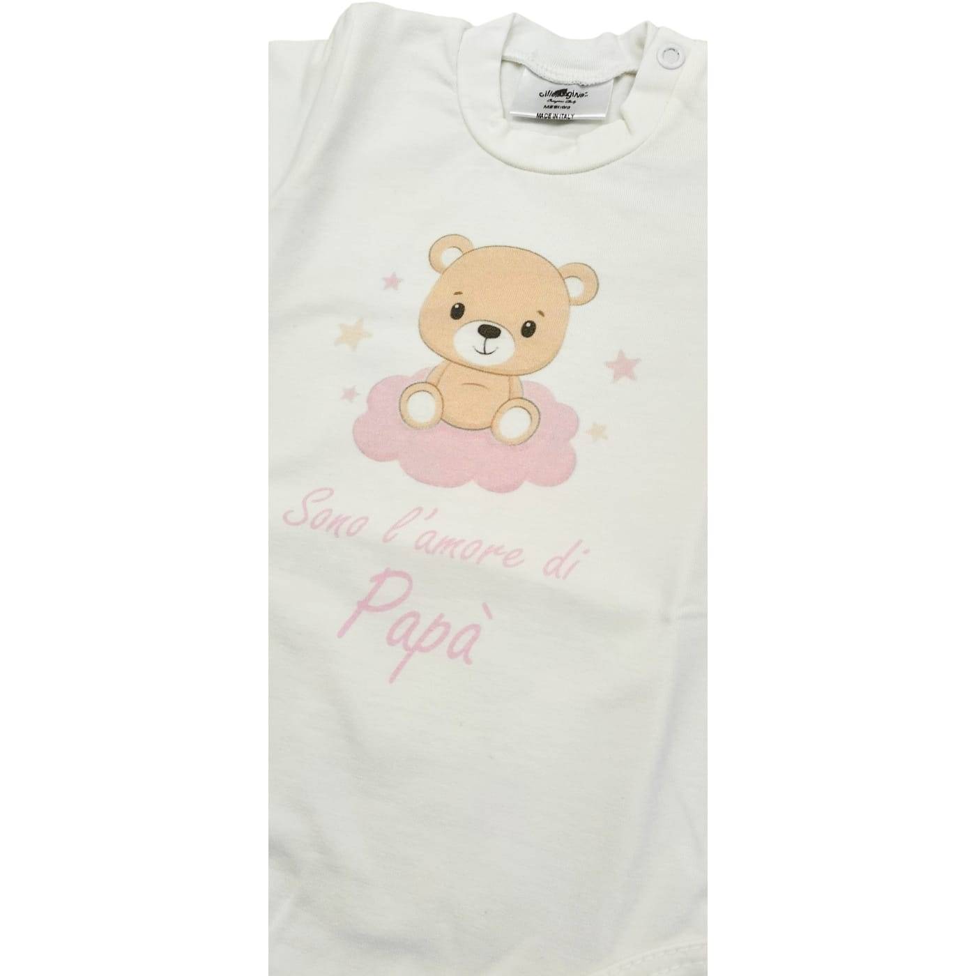 Body de algodão quente com mangas compridas, gola redonda com botões laterais para facilitar a colocação. Parte inferior em cor creme clara com estampado digital que ilustra um ursinho de peluche na lua e a frase "I am Daddy's darling".