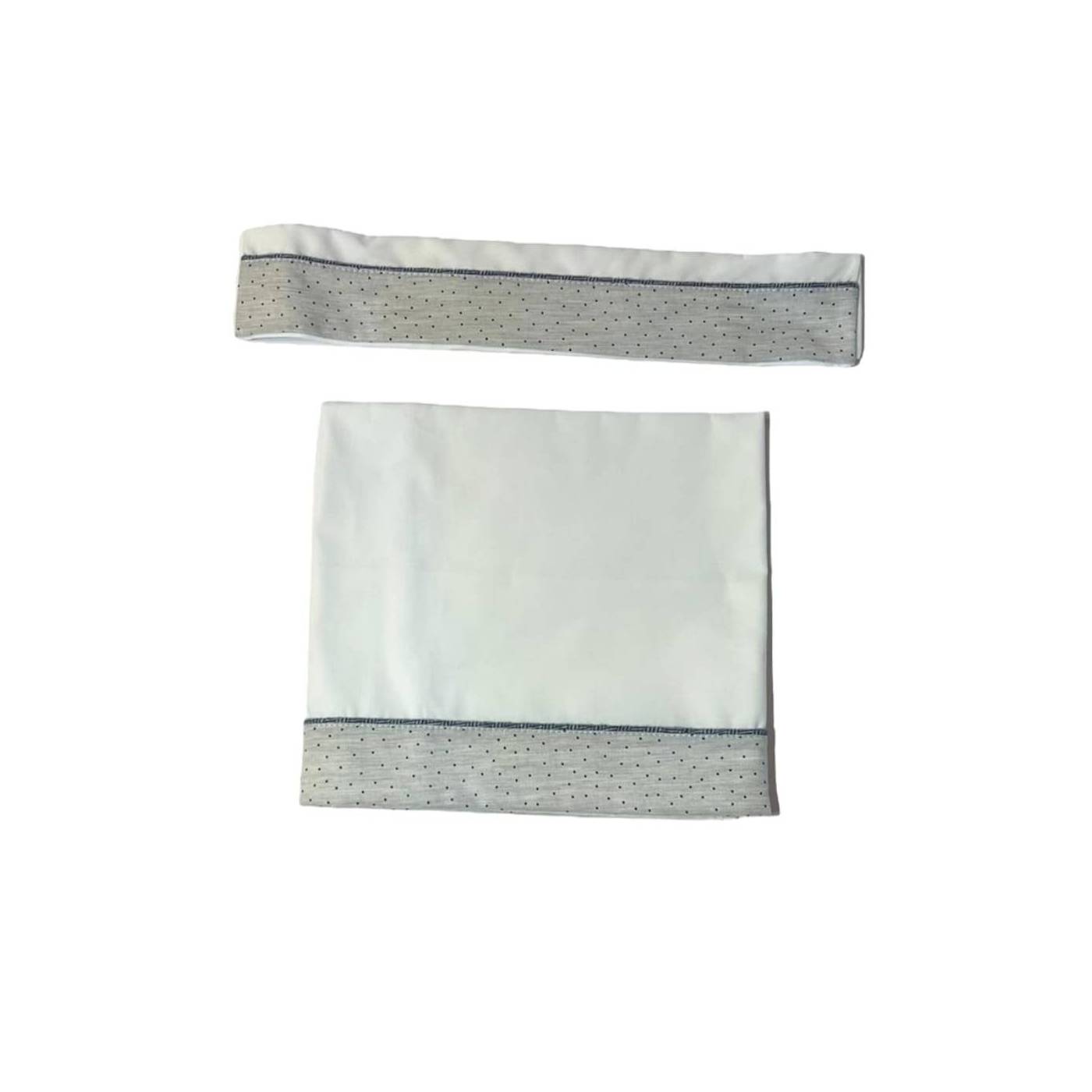 Lençol de bebé de 3 peças (com fronha e parte de baixo com cantos) em puro algodão branco com folho cinzento e bolinhas azuis, medindo 84*118 cm. Facilmente adaptável a capas ou utilizado individualmente no verão. Recomenda-se uma lavagem suave.