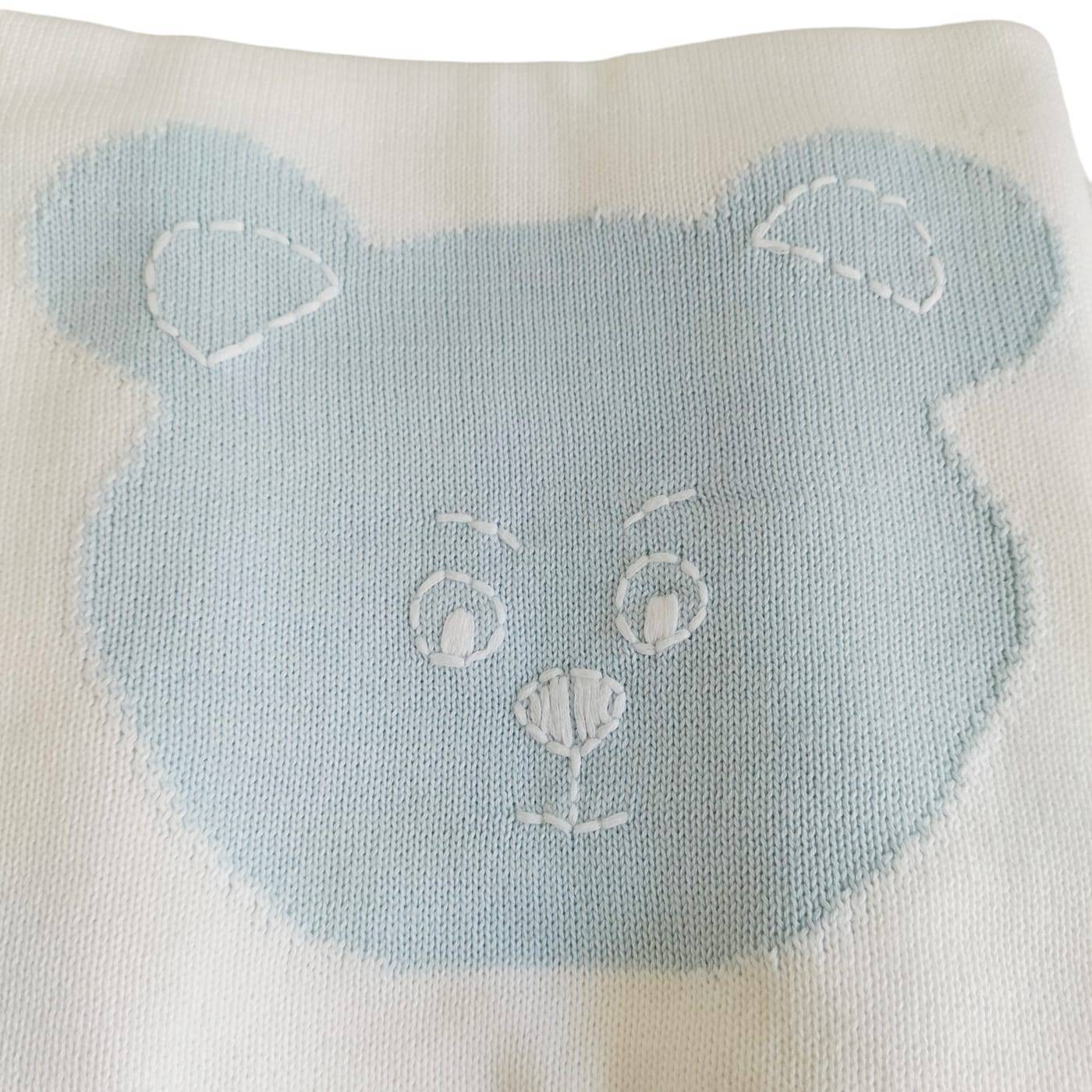 Capa de xaile muito macia em fio de algodão de dupla camada, fundo branco com ursinho central azul claro.