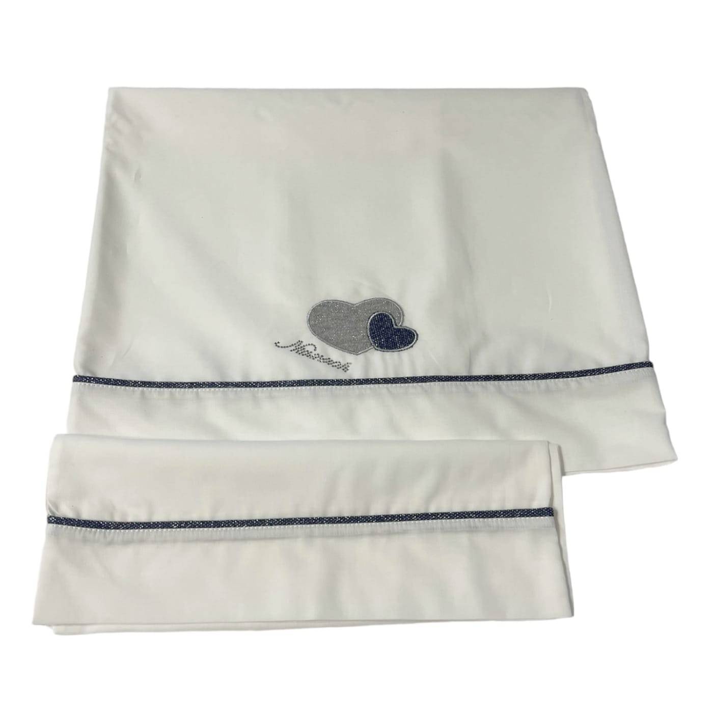 Lençol de bebé de 3 peças (com fronha e parte de baixo com cantos) em puro algodão branco com corações cinzentos e azuis e as palavras "Ninnaoh" com purpurinas. Tamanho 80*106 cm. Pode ser combinado com capas ou utilizado individualmente no verão. Recomenda-se uma lavagem suave.