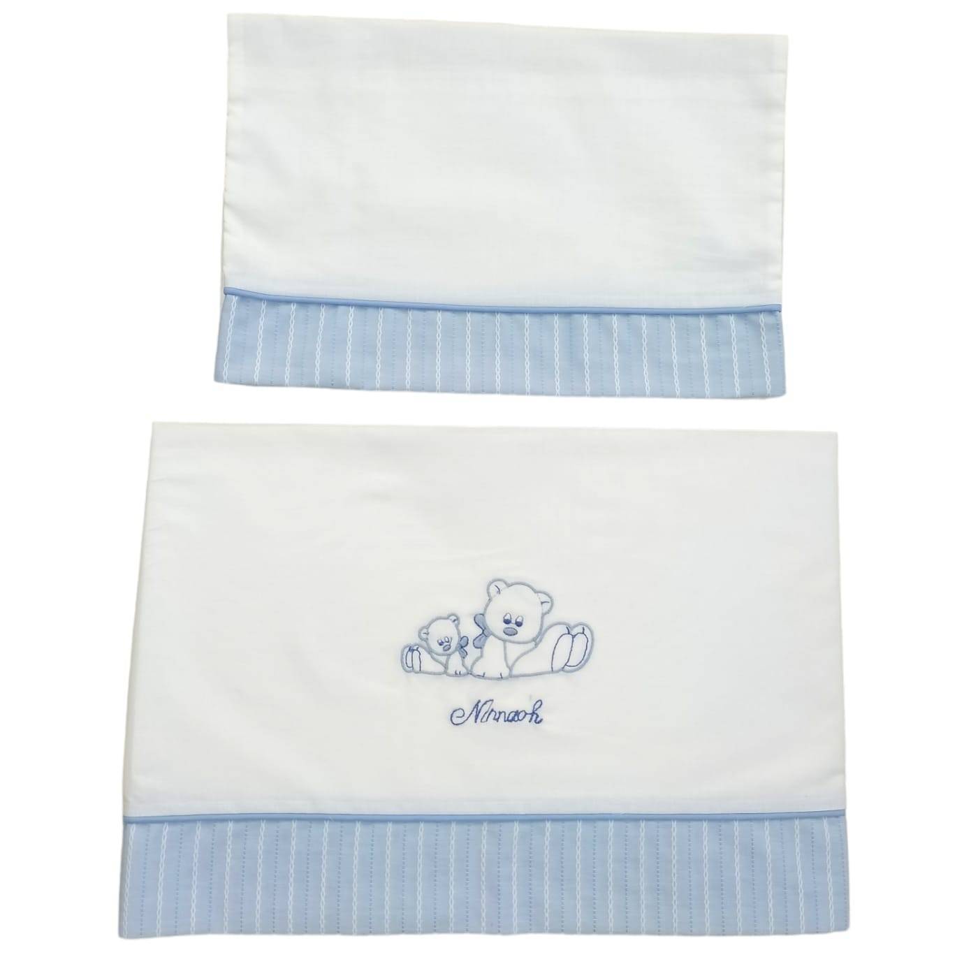 Manta de xaile em algodão azul claro (não preparada para acolchoamento) e lençol (3 peças com fronha e parte inferior com cantos) com fundo branco a condizer em 100% algodão puro, com bordado de ursinho. Ideal para nascimentos a meio do verão.