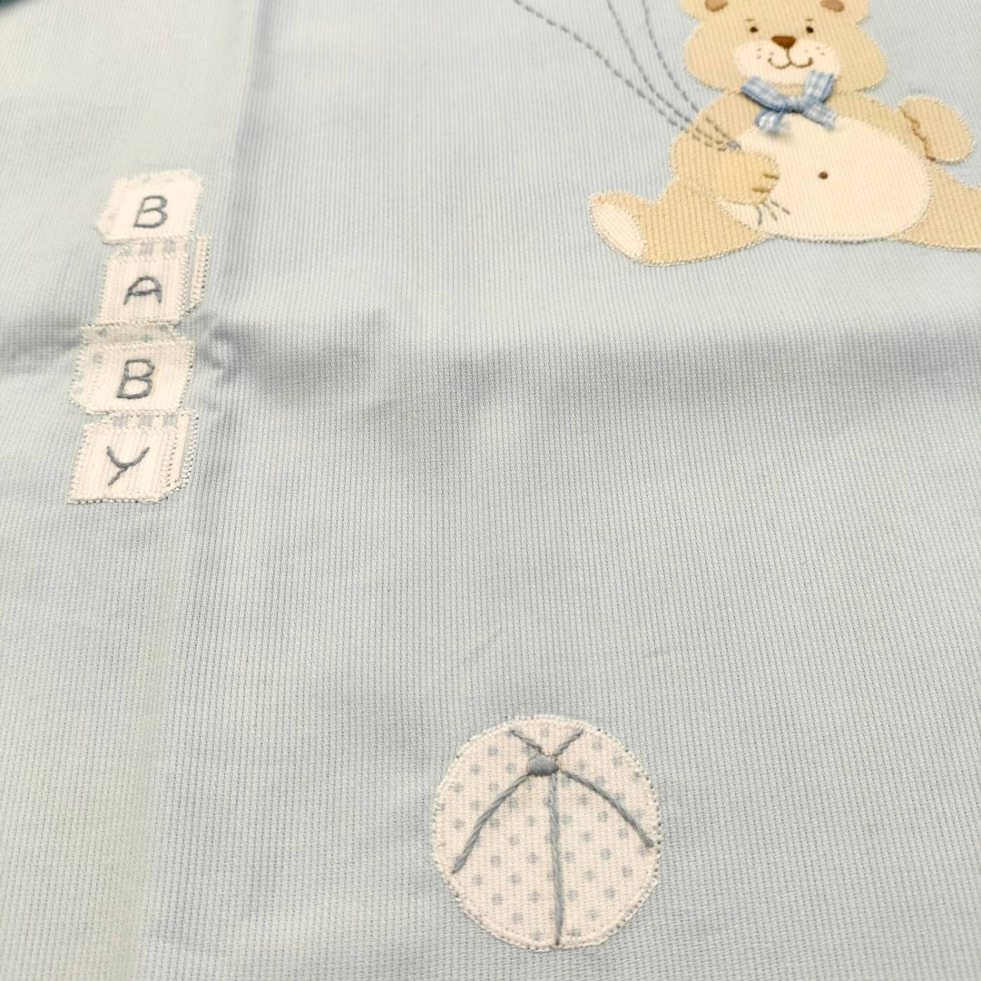 Este conjunto é confeccionado com a técnica do aplique manual, pequenos pedaços de tecido recortados à mão e montados com pequenos pormenores bordados à mão, como as caras dos animais, o fio dos balões...