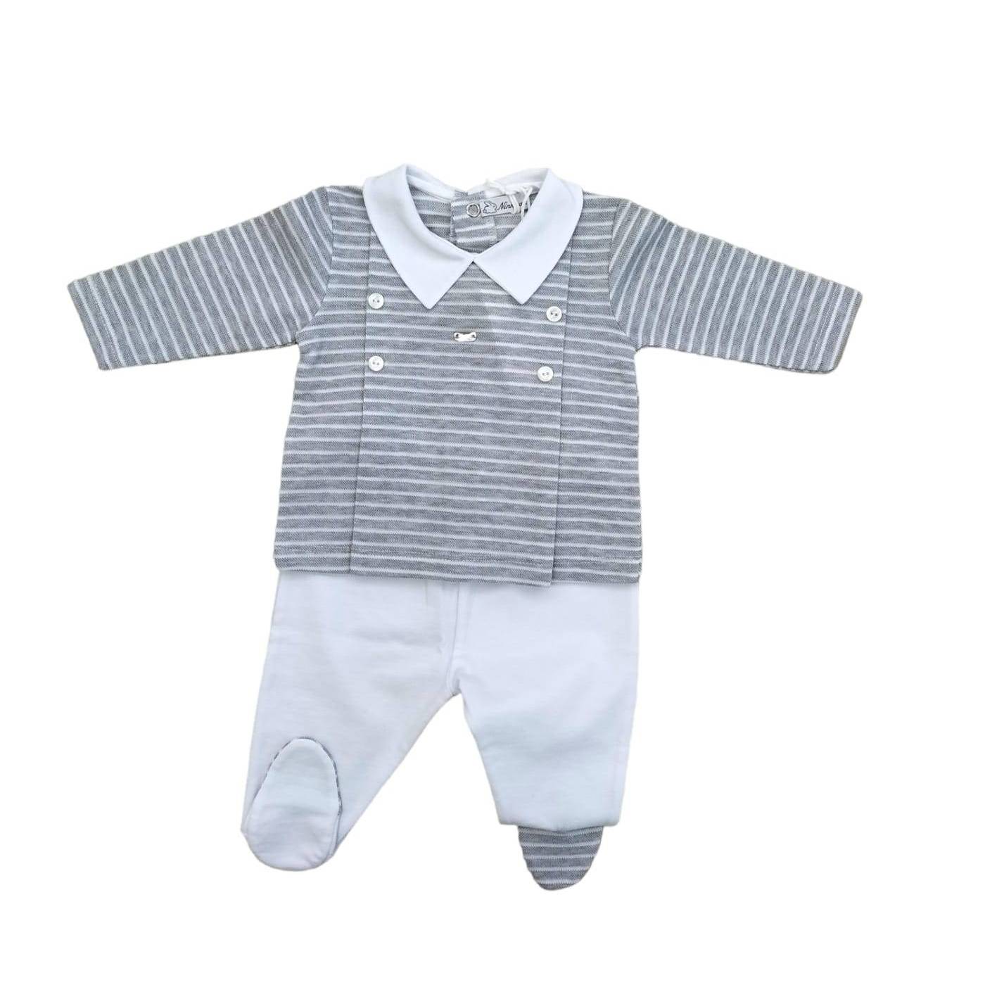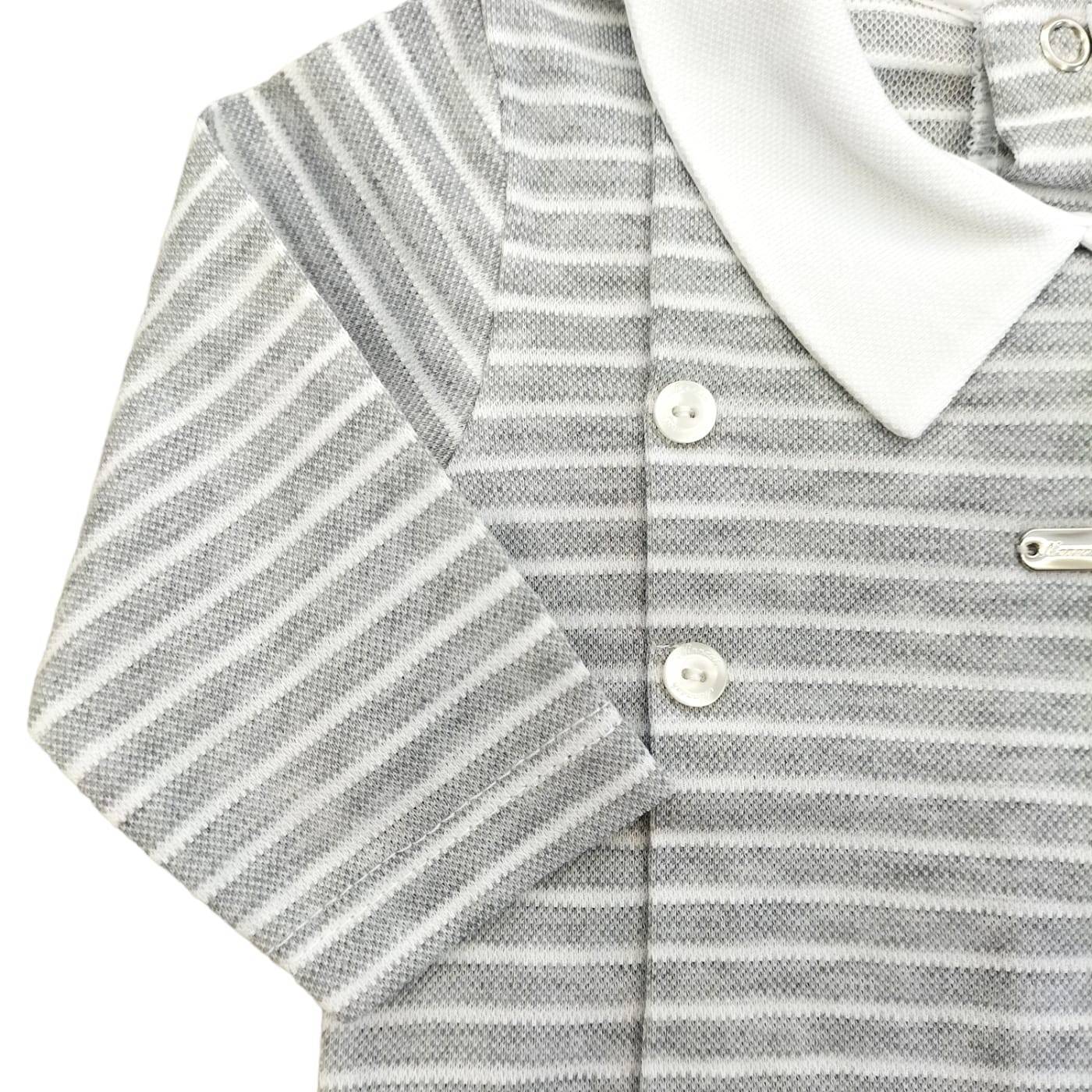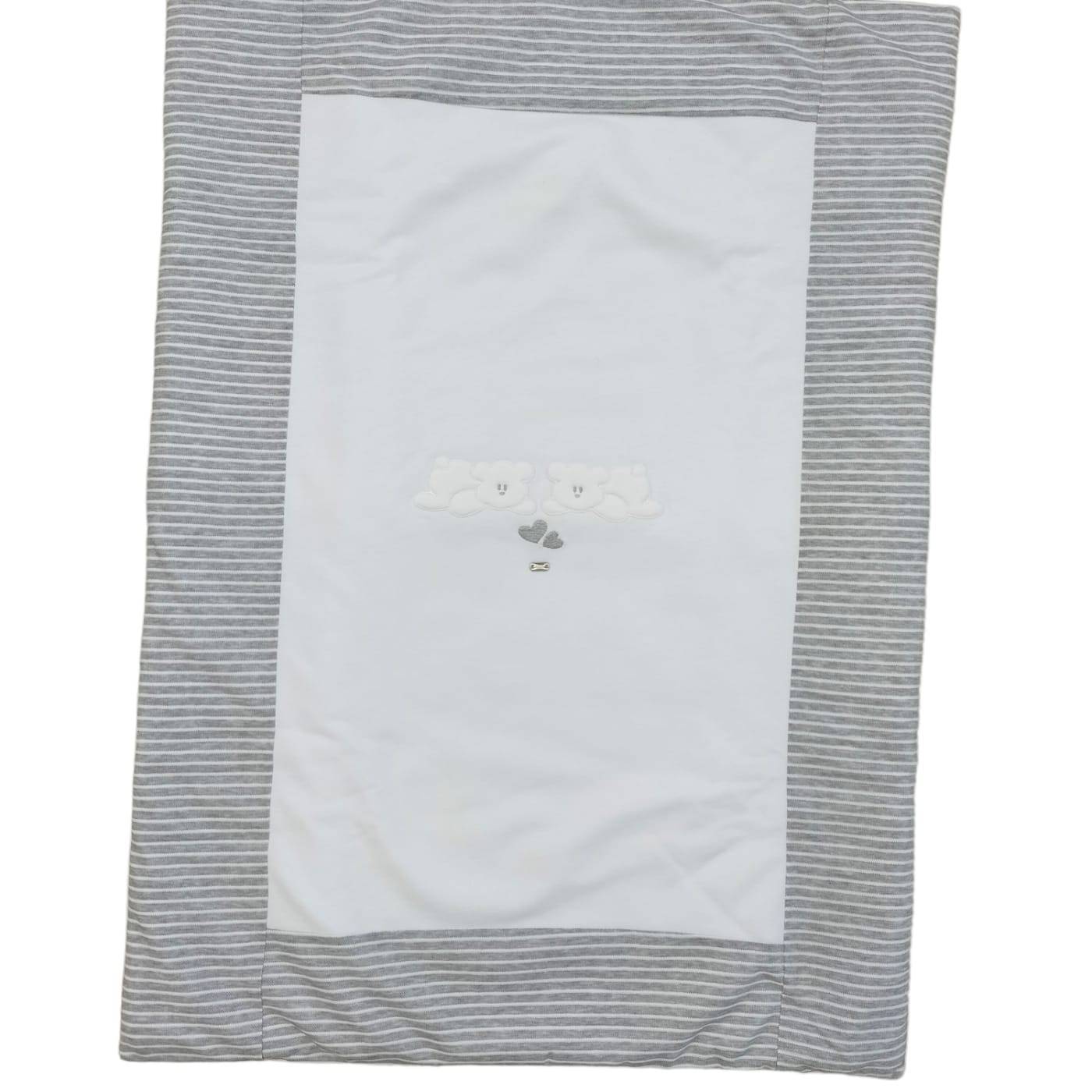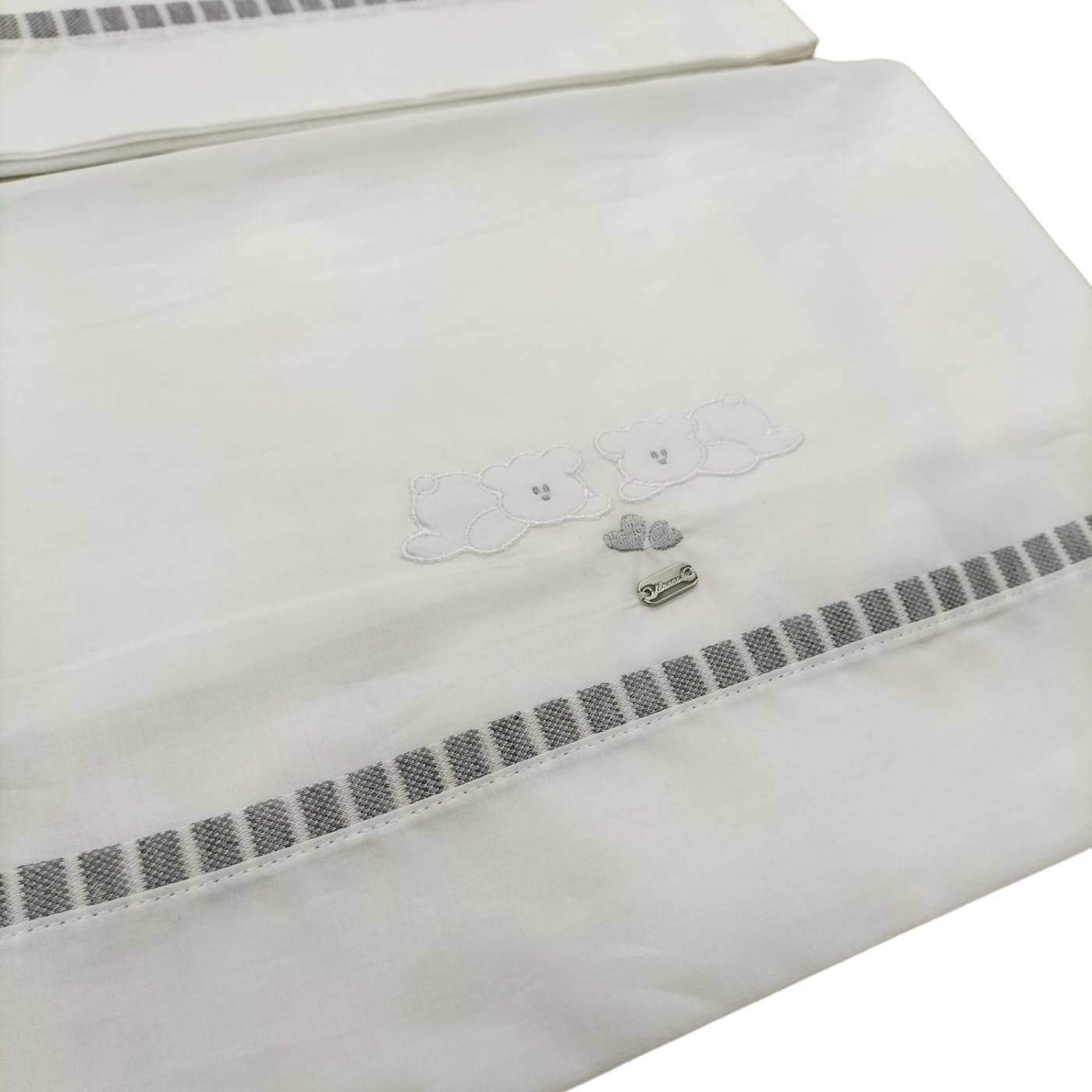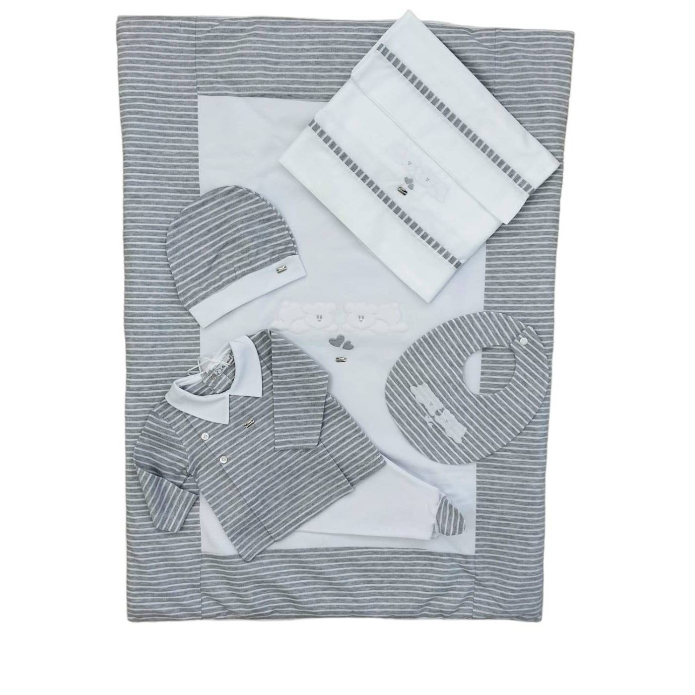 Este conjunto é o resultado da combinação de 2 tipos de tecido: base branca e jersey micro-rebordado às riscas cinzentas e brancas, tudo acompanhado de ursinhos bordados com apliques. Ideal para a nova mãe que procura cores alternativas às cores clássicas do bebé.