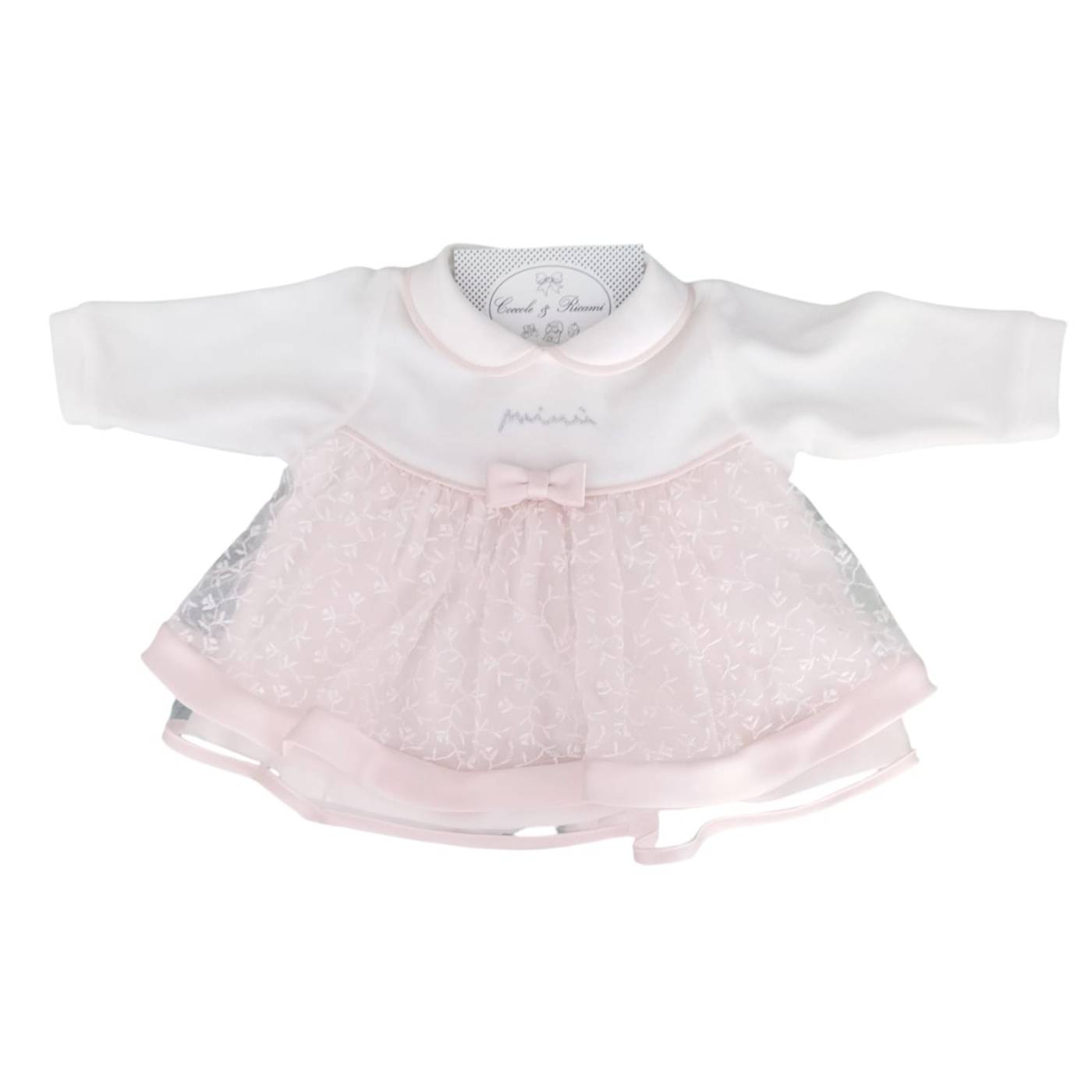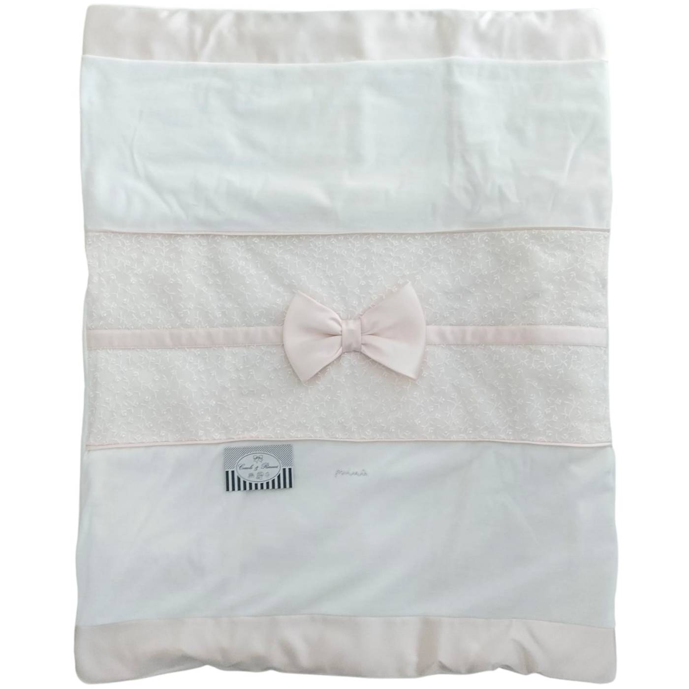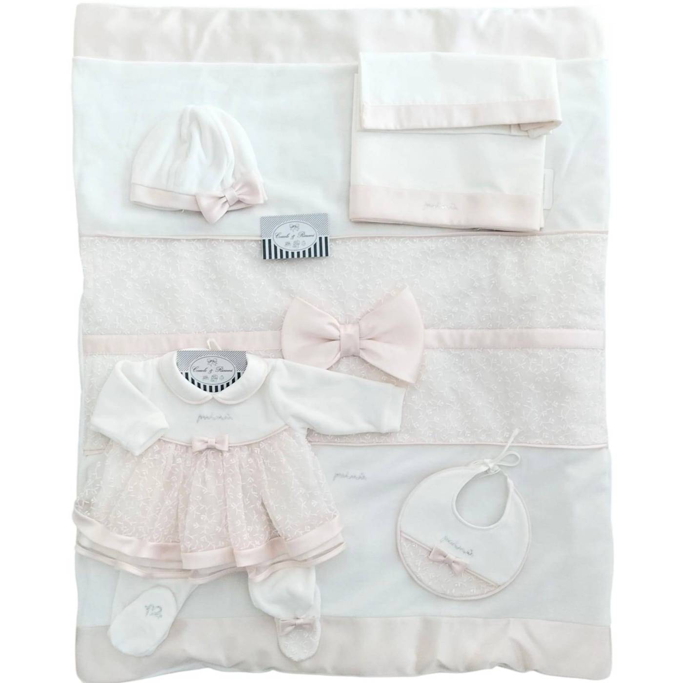 Um conjunto de recém-nascido elegante e requintado está pronto para receber a sua princesinha. Este enxoval totalmente italiano da marca Minù é confeccionado sobre uma base de chenille branco leite, enriquecido com pormenores em cetim de seda rosa e rendas finas que conferem luminosidade e sumptuosidade à peça.