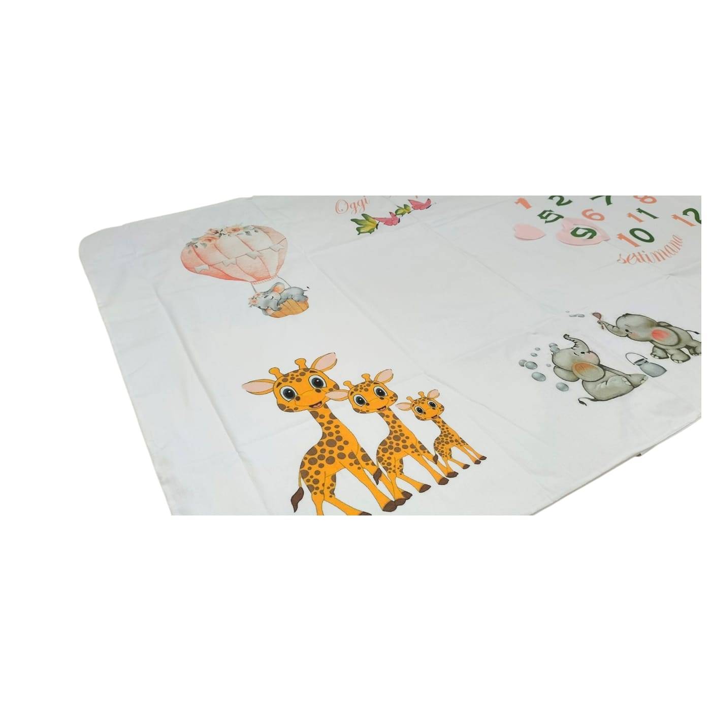 100% algodão, medindo 90*120 centímetros, também pode ser utilizada como capa para o carrinho de bebé, tapete de brincar, para embalar o bebé...