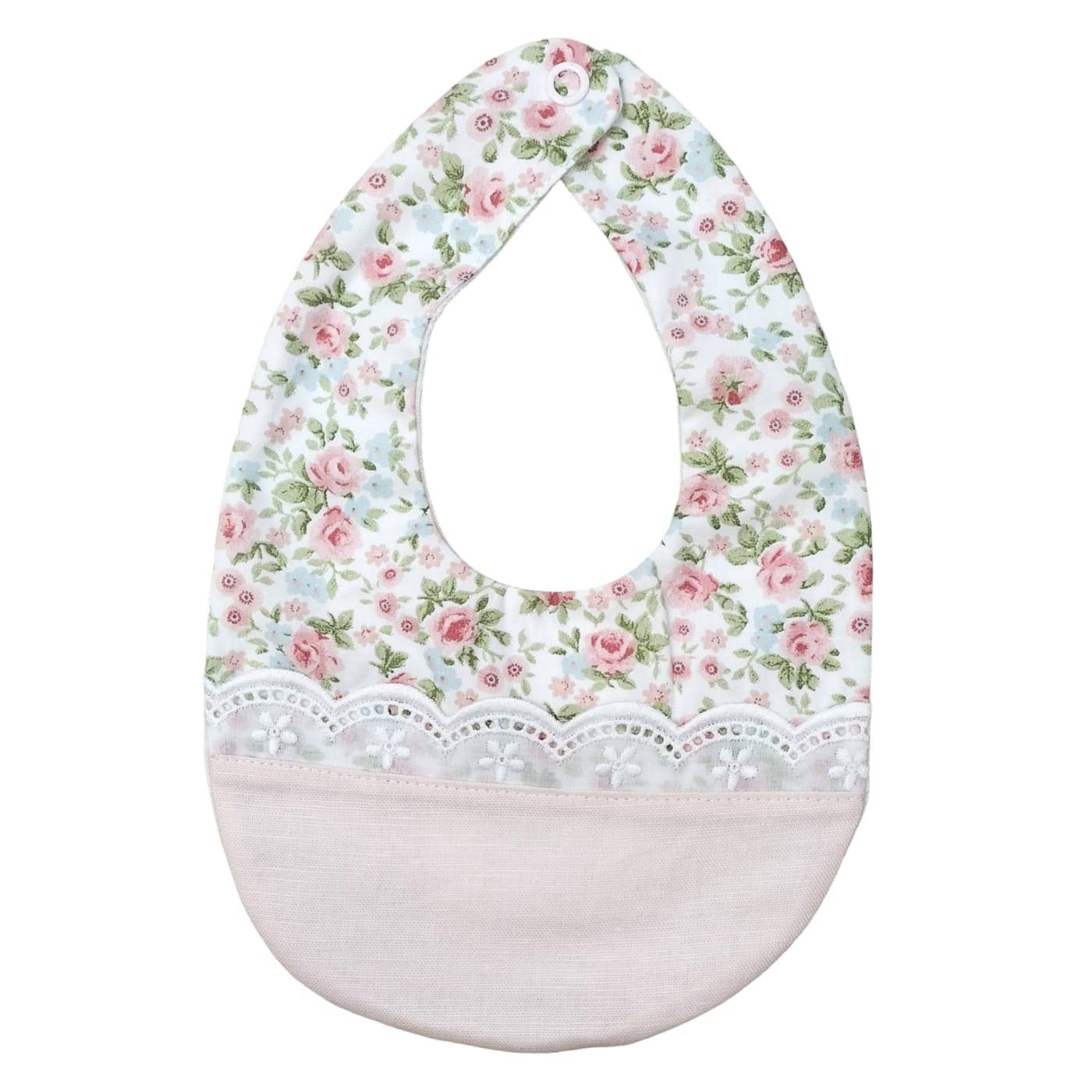 Este conjunto para recém-nascidos do sexo feminino está completo com tudo: edredão com acolchoamento amovível graças à abertura nas costas com botões, metade da capa é em linho e a outra metade em tecido floral, no centro uma faixa em tecido de linho verde-salva e uma fina renda St; um cobertor de 2 peças constituído por um vestido com saia efeito boneca e ghettina, tamanho 1 correspondente a 50/56 centímetros; um lençol de 3 peças com fronha e parte inferior com cantos, fundo branco com folho floral e renda San Gallo; finalmente, um babete e uma touca, esta última indispensável desde as primeiras horas de vida do bebé.