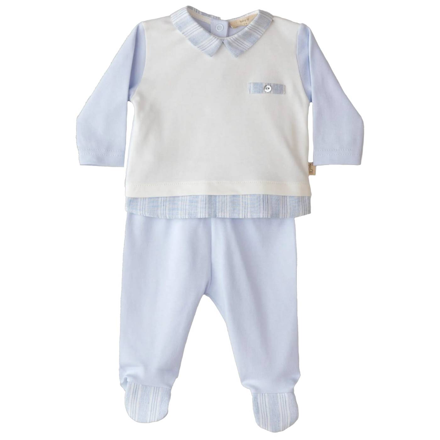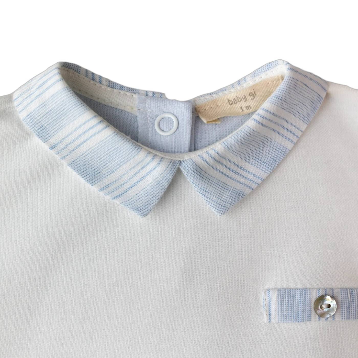 Em jersey de algodão, tem uma parte da frente em cor creme claro e pormenores em tecido de algodão às riscas, mangas compridas em azul claro, bem como a polaina.
