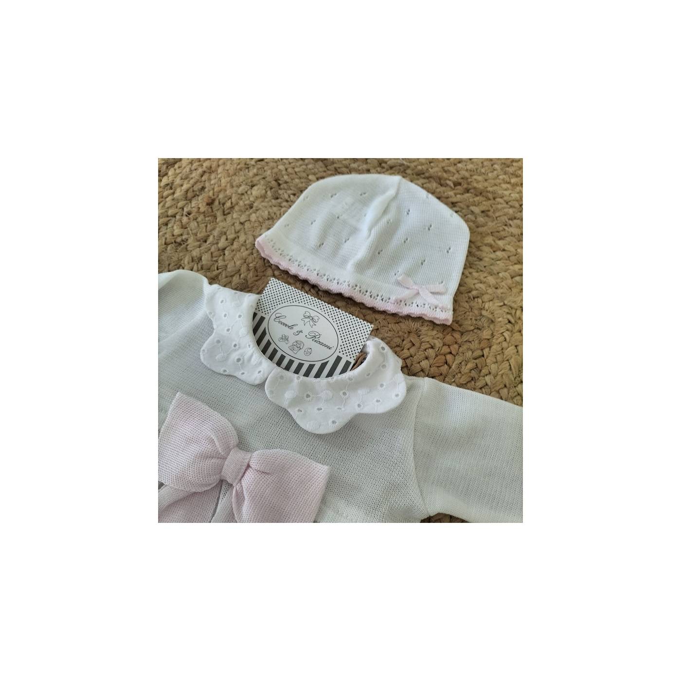 Um macacão para recém-nascido em algodão rosa suave, para acolher o seu bebé com todo o conforto, sem renunciar aos detalhes e aos cuidados. A gola, os pés e o laço na faixa são em algodão com um padrão microfloral com predominância de verde. A mesma cor encontra-se no corpete, mas acompanhada por uma fina renda St. Gallen branca.