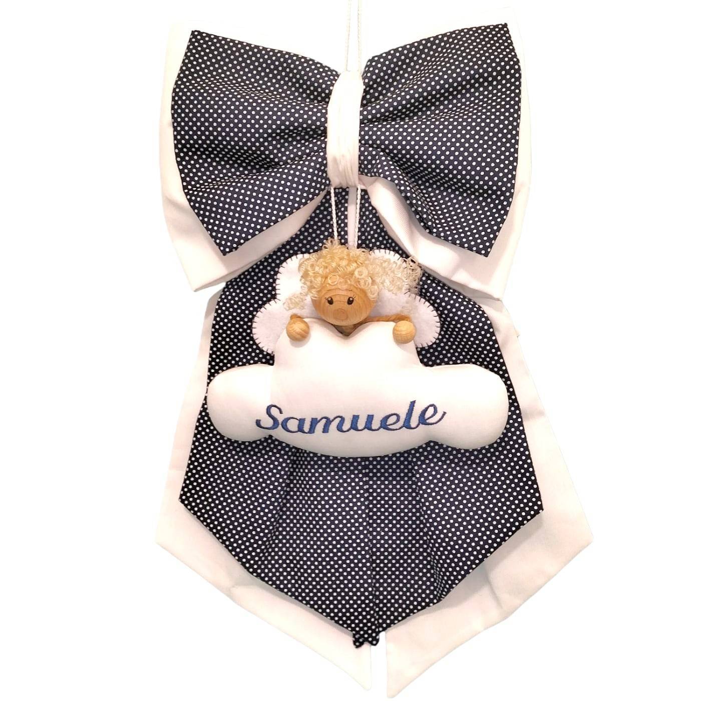 Laço de nascimento para recém-nascido, composto por 2 tecidos: no verso, tecido simples branco, e na frente, tecido azul com pequenas bolinhas brancas, tudo acompanhado por um anjinho de cabelo louro encaracolado e cara de madeira. O nome na nuvem branca está escrito em azul contrastante. Se for esta a sua escolha, contacte-nos através do whatapp para especificar o nome.