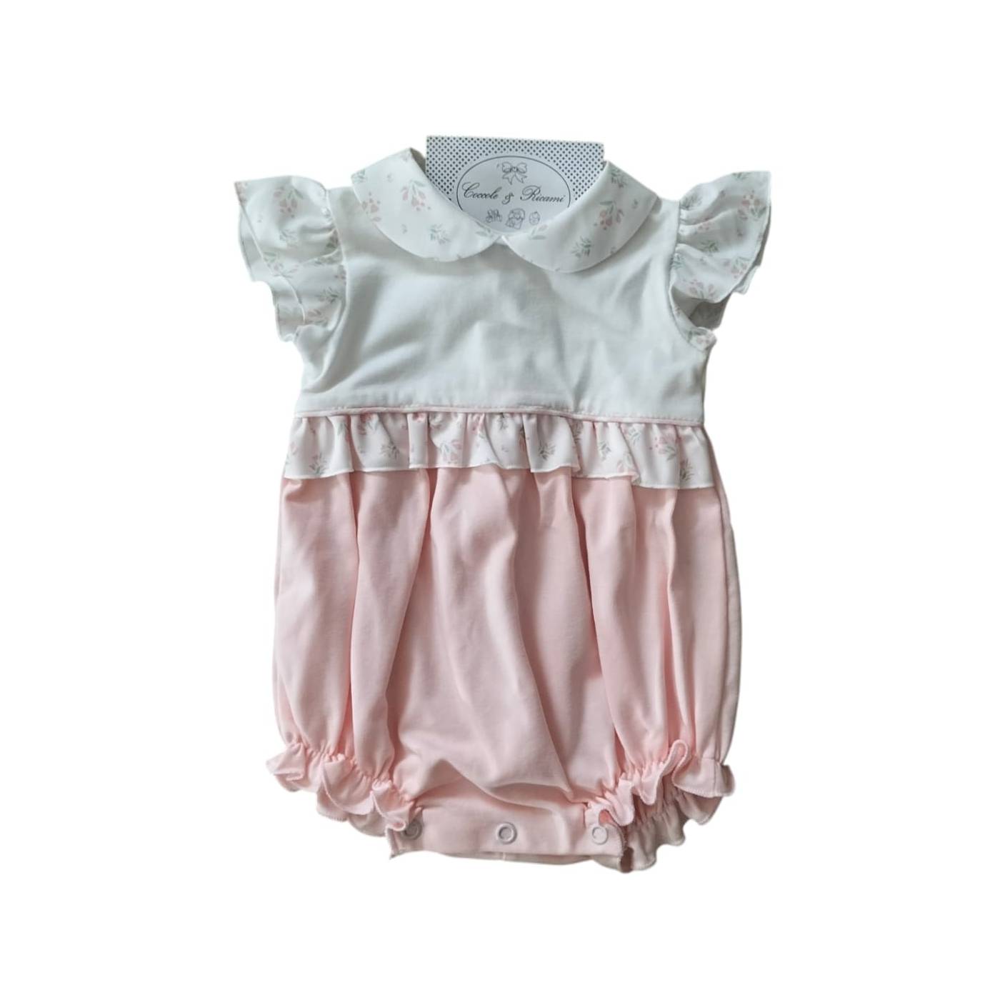 Este macacão não é mais do que um vestido de body em jersey de algodão, forrado na parte superior, corpete e mangas, ainda em algodão, e depois por um maravilhoso tule com fundo branco com borboletas em relevo debruadas a rosa. Tamanho 1 mês correspondente a 50-56 cm, ideal para os mais pequenos que chegam a meio do verão, graças ao contacto do algodão com a pele sem renunciar à particularidade da peça.