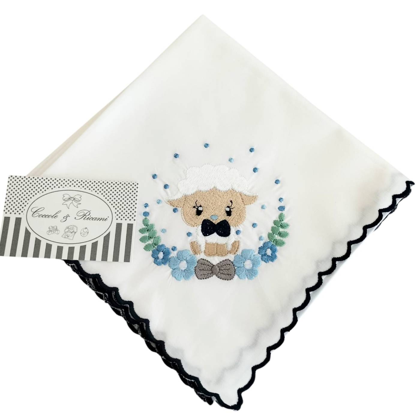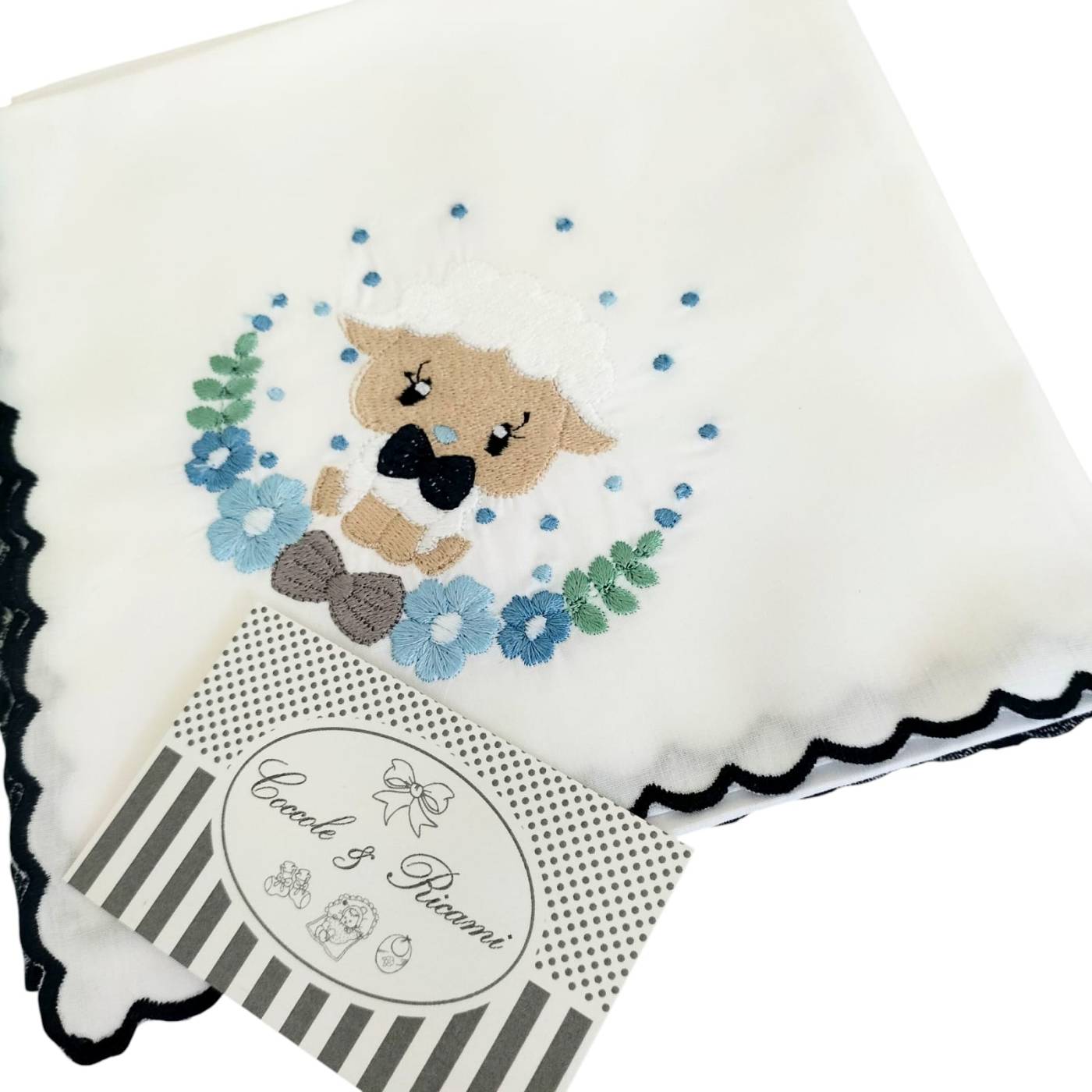 Quadrado de musselina em puro algodão, redefinido com vieiras azuis, com uma ovelhinha bordada num canto.