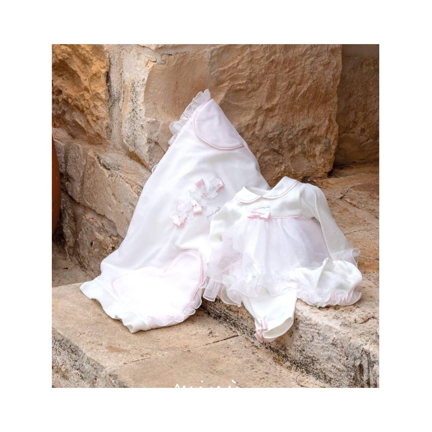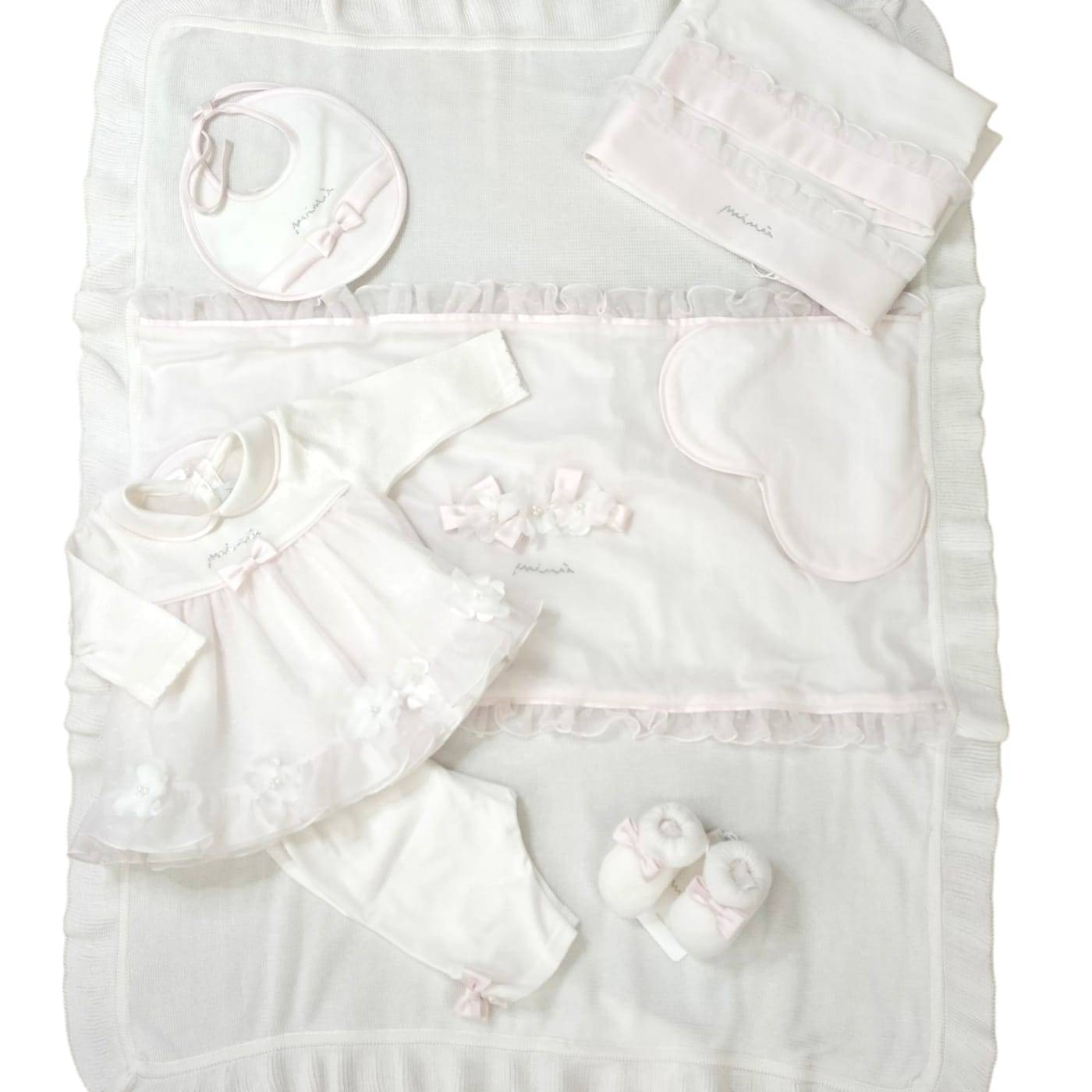 Se quer receber o seu bebé como uma princesa sem renunciar à qualidade dos tecidos e ao fabrico inteiramente italiano, este conjunto para recém-nascido é a escolha certa para si!