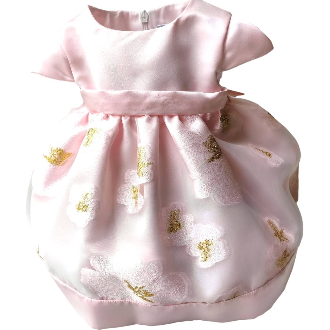 Vestido elegante para bebé menina da marca Barcellino. Corpete em cetim de seda rosa liso e manga curta; alça na cintura e saia estilo boneca em organza com padrão floral rosa com pormenores dourados e acabamento em cetim. O interior é forrado em puro algodão, pelo que é adequado para o verão.