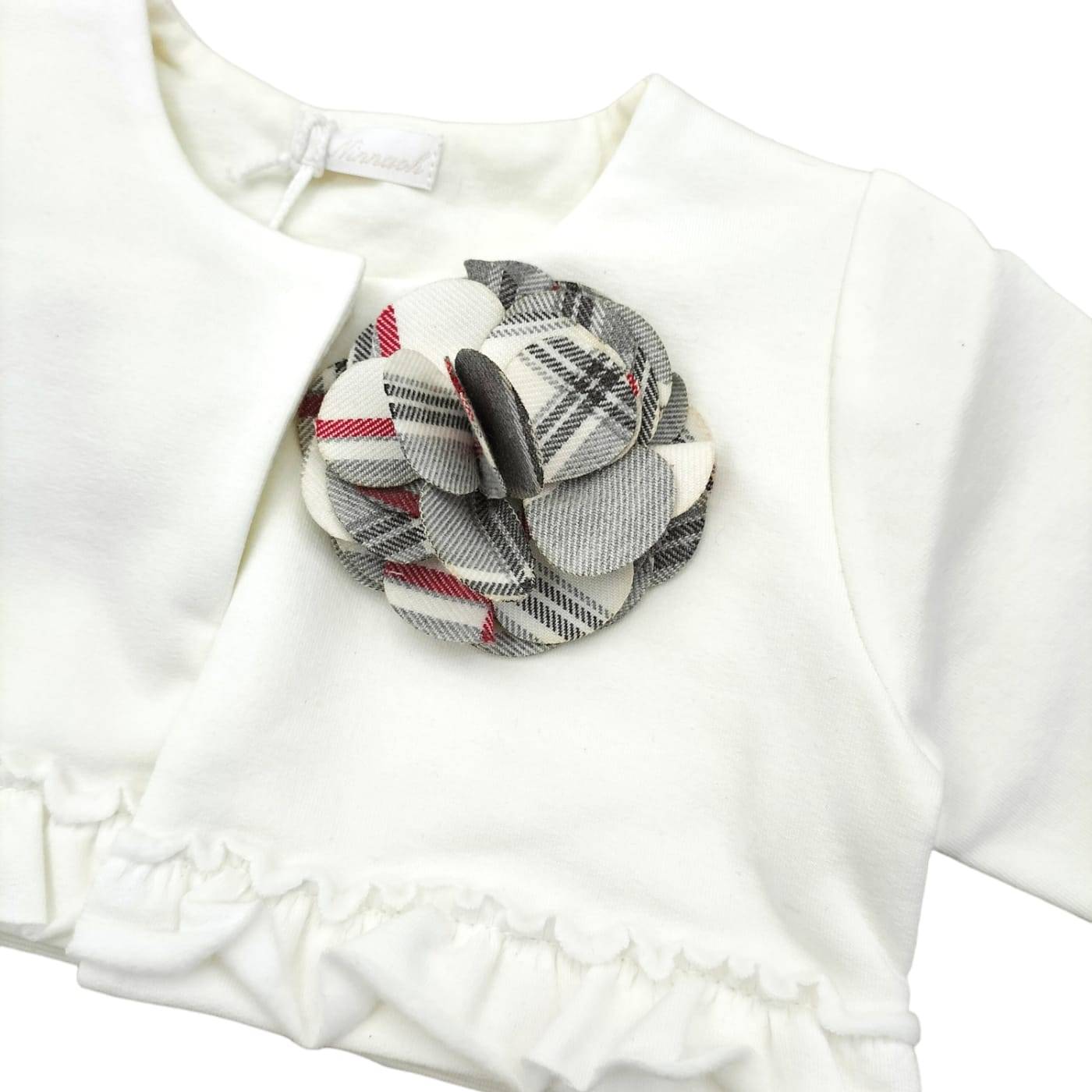 Vestido elegante de meia-manga da marca Ninnaoh em tecido tartan cinzento, creme e vermelho, acompanhado da sua capa de algodão creme quente com uma flor lateral que faz eco do tecido do vestido. Ideal para ocasiões de inverno.