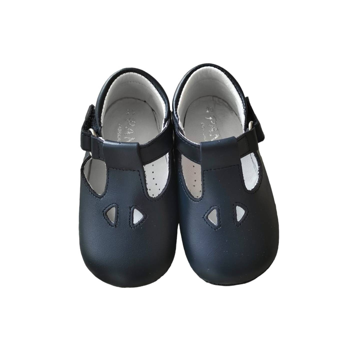 Botins de berço em pele azul muito macia com ilhós/olho de fivela.