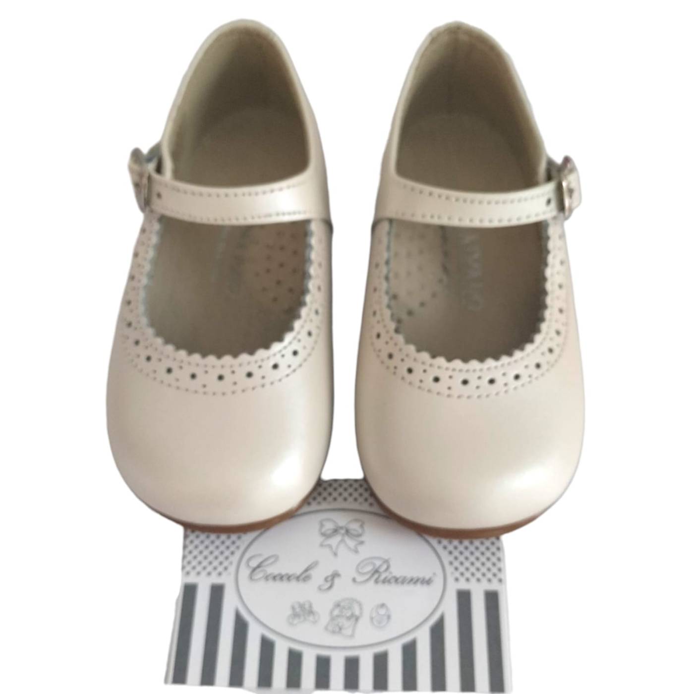 Sapato elegante estilo bailarina para menina, em pele genuína e brilhante de cor creme a tender para o bege, com fecho de fivela lateral. Palmilha anatómica e sola antiderrapante castanha.