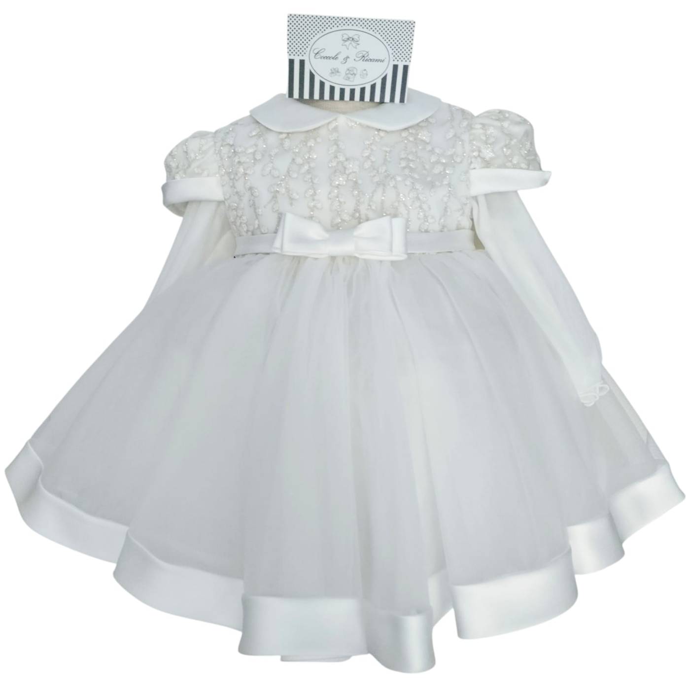 Vestido elegante de menina de 12 meses para batizado ou cerimónia com fita para o cabelo a condizer. O vestido é de meia manga, o corpete é inteiramente revestido de macramé cor-de-rosa, na cintura um bonito laço que encontramos na fita para o cabelo; a saia é feita de várias camadas de tule branco que criam volume, dando um efeito de boneca, e um comprimento mais comprido na parte de trás da saia, tudo acompanhado de uma alça falsa nas costas em tule branco para dar um nó e formar um laço.