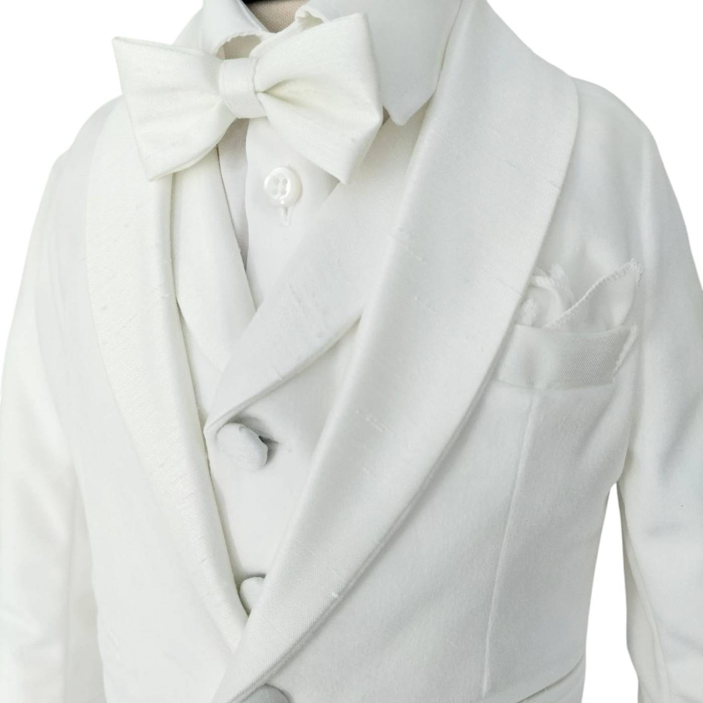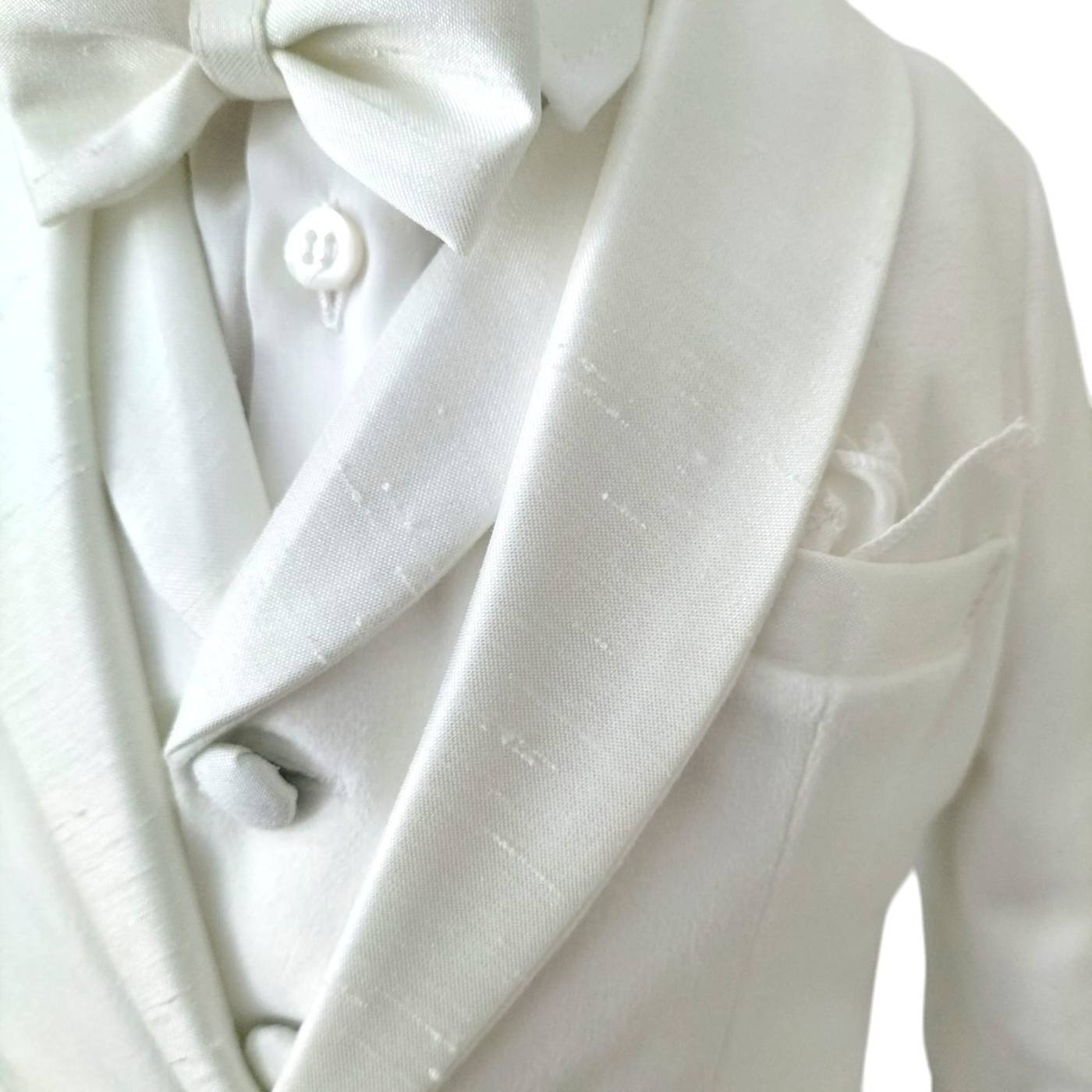 De cor branca leitosa, é composto por 5 peças: camisa de algodão com mangas compridas; laço, colete, casaco e calças, tudo num veludo muito macio que acariciará e mimará o seu filho, sem renunciar à elegância ao mesmo tempo, este fato é uma mistura de conforto e estilo.